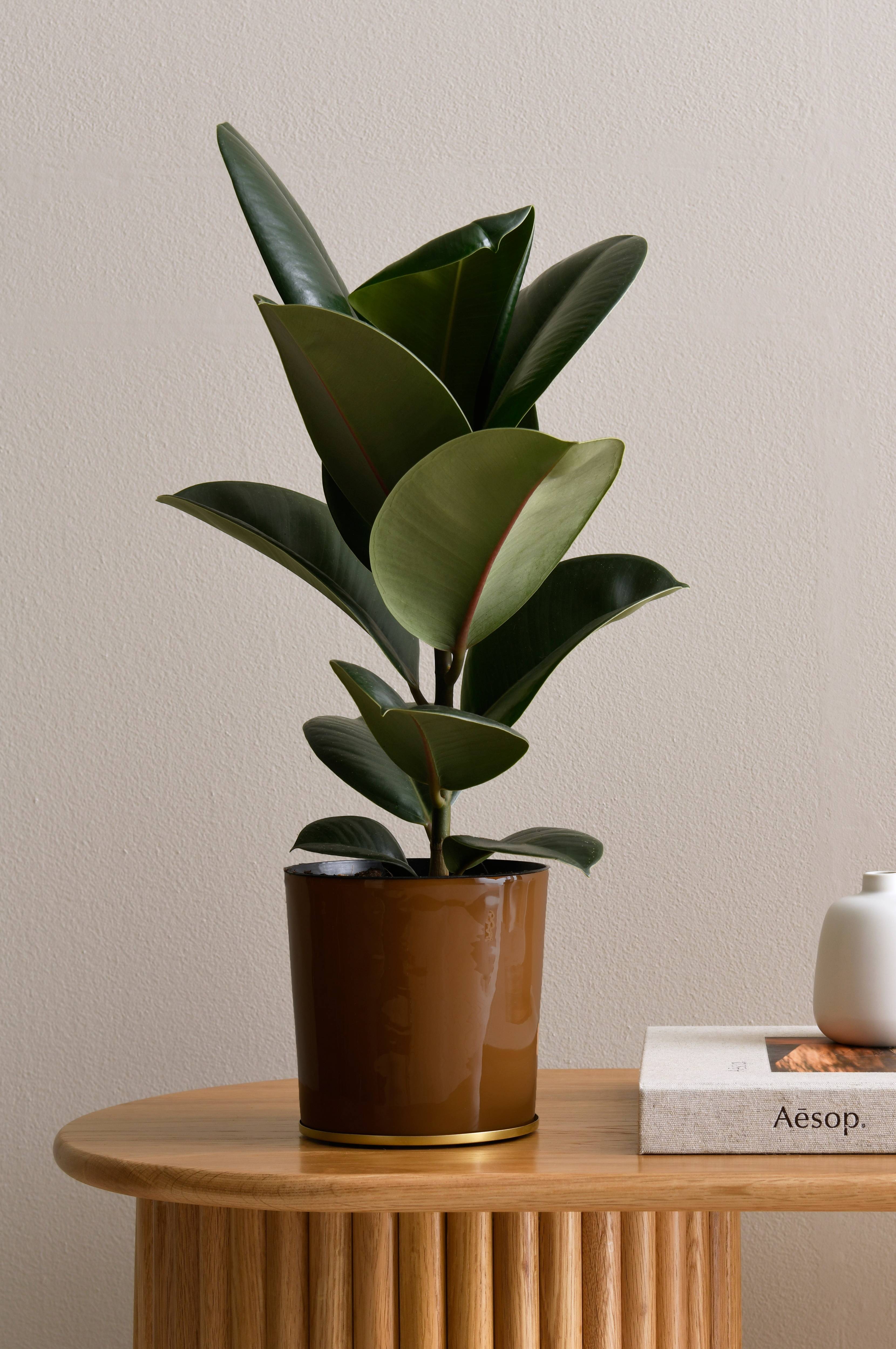 Kruka av metall med pulverlackad yta och fat av äkta mässing. Höjd 13 cm, Ø 13 cm.