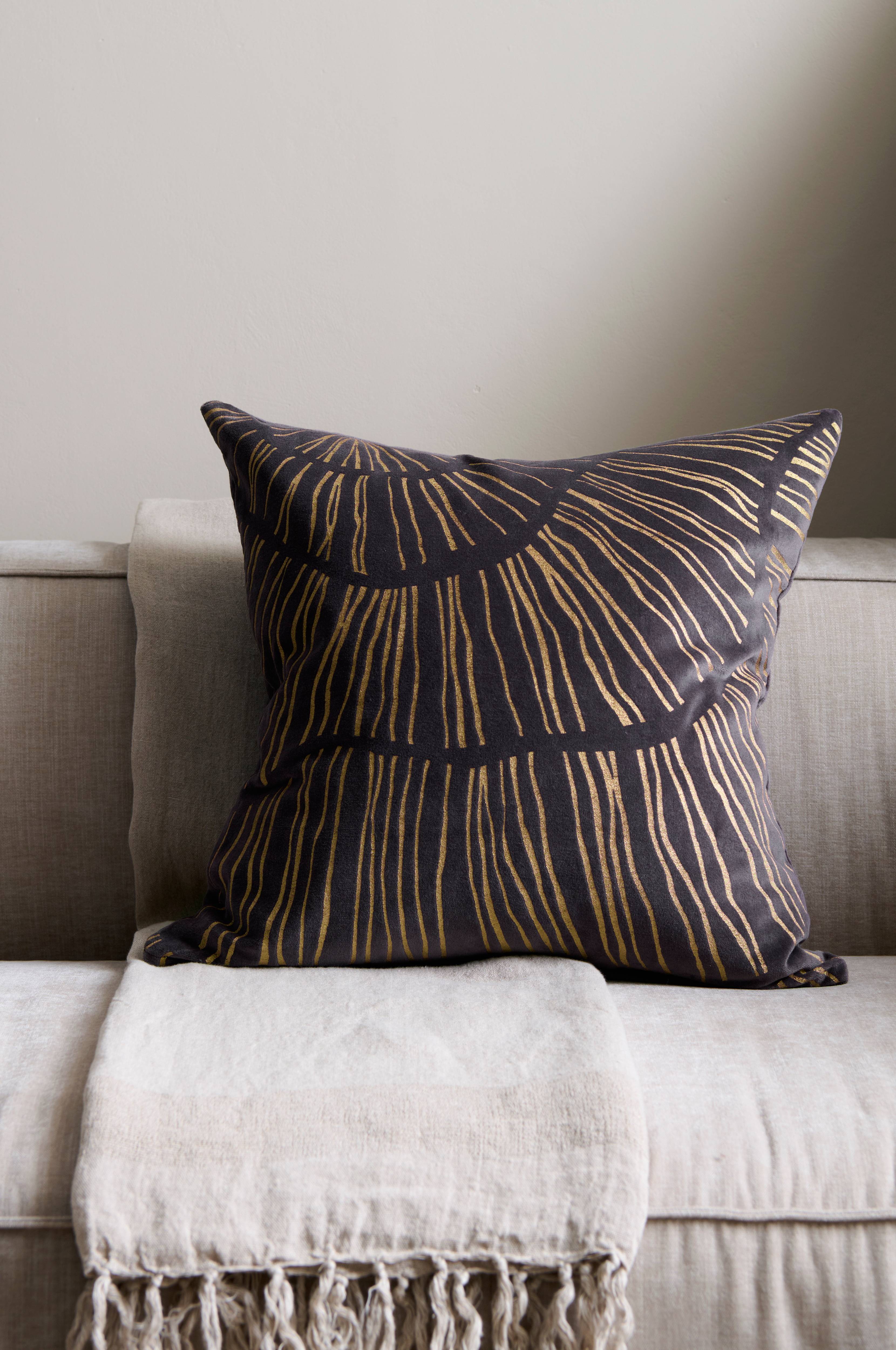 Kuddfodral i bomullssammet med metallictryck på framsidan. Enfärgad baksida. Metalldragkedja i botten.
