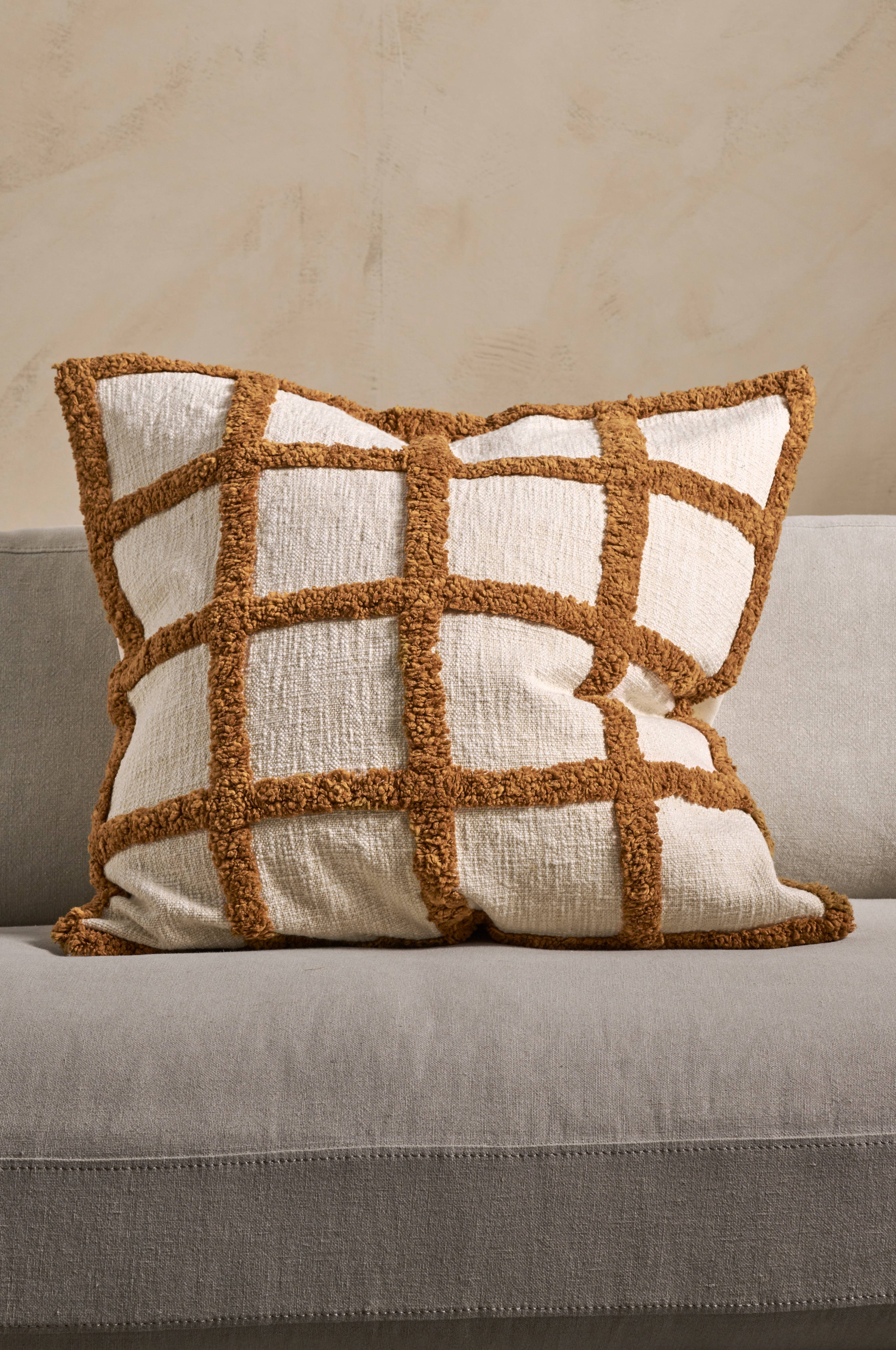 Mjukt kuddfodral av bomull i kraftig kvalitet med tuftade rutor på framsidan och slät, enfärgad baksida. Dragkedja.