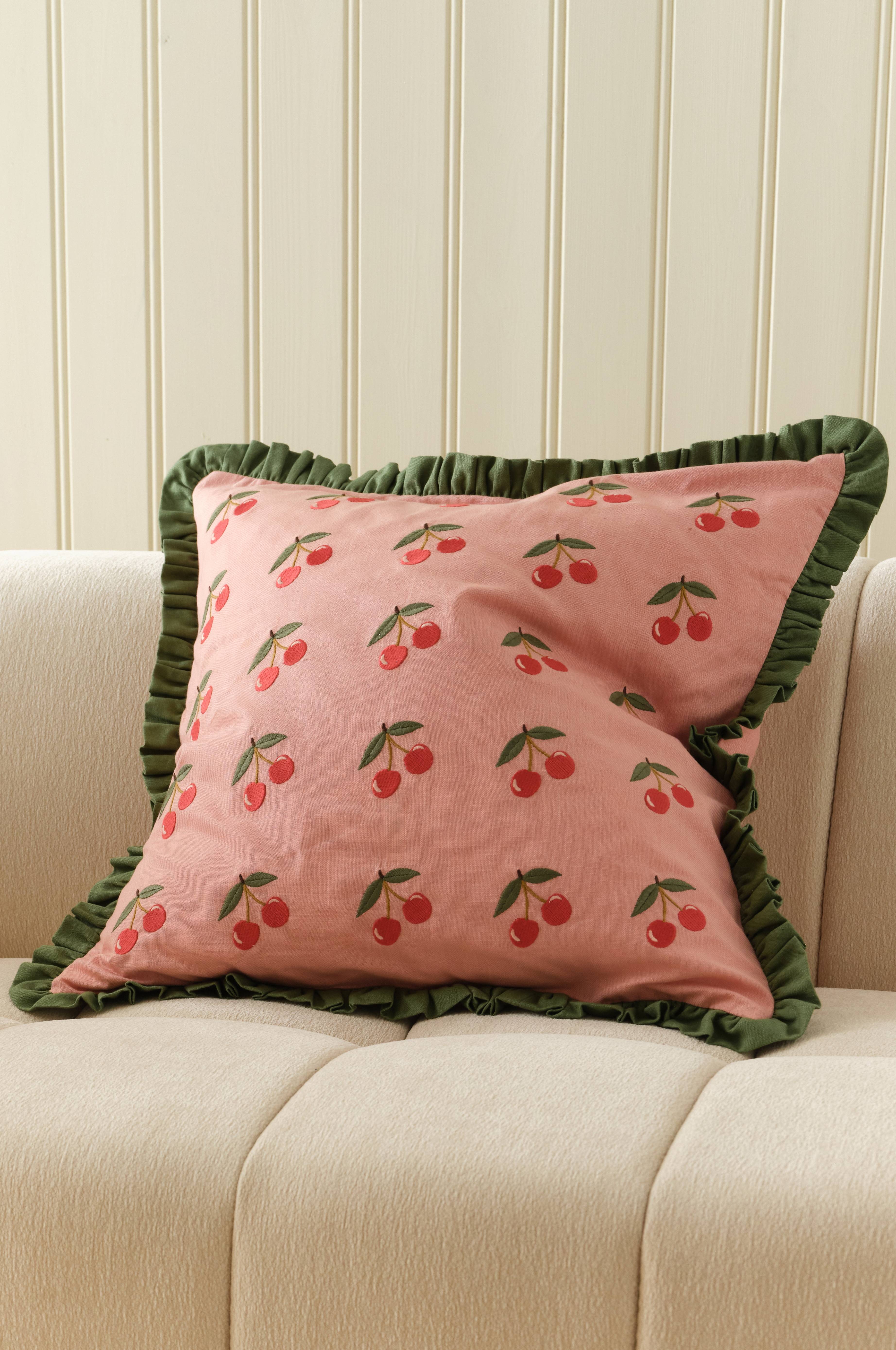 • Kuddfodral i bomull med körsbärsbroderi fram