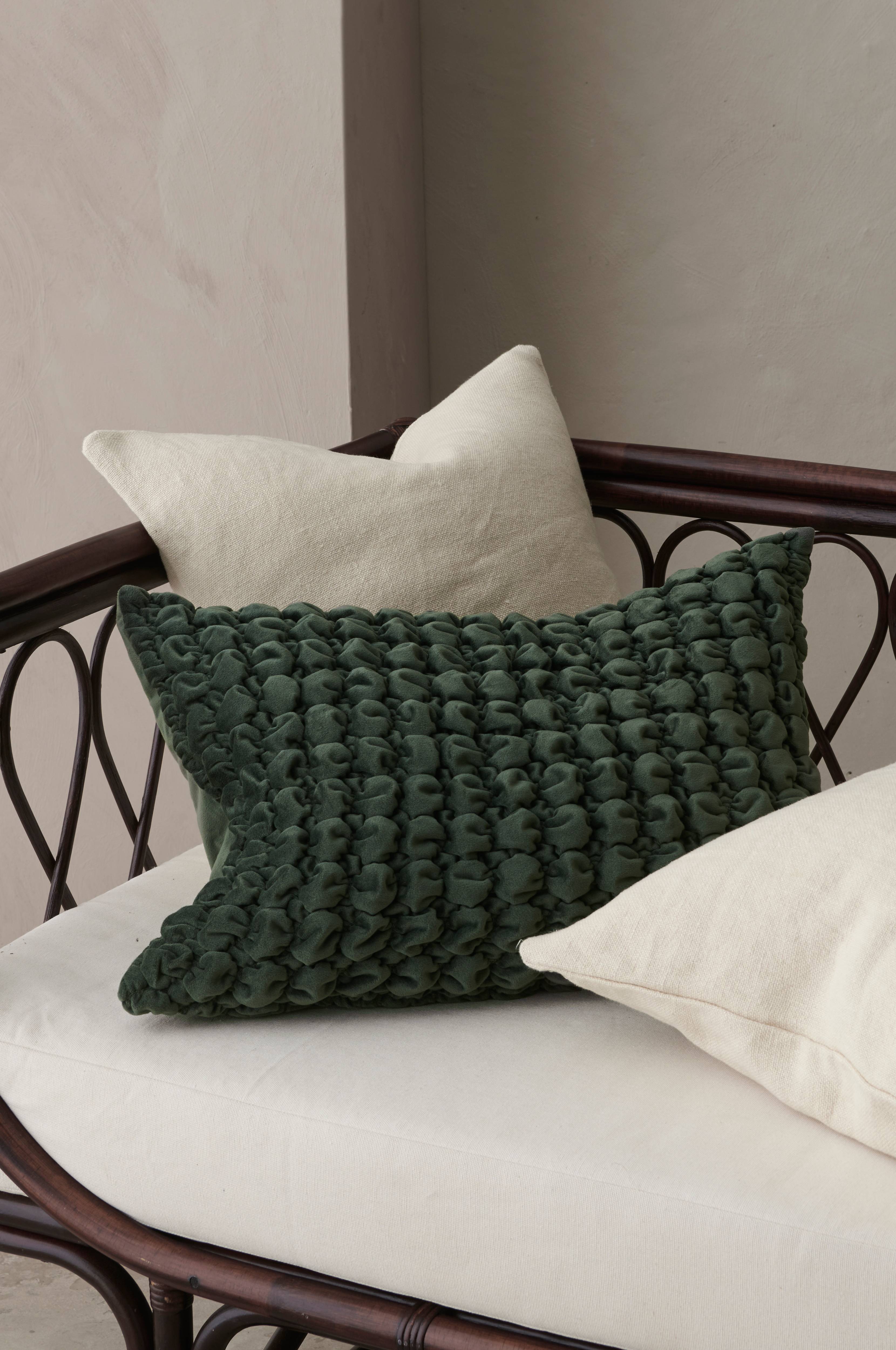 Kuddfodral av sammet med fin lyster och ett sytt, dekorativt mönster på framsidan. Slät baksida. Dragkedja i botten.