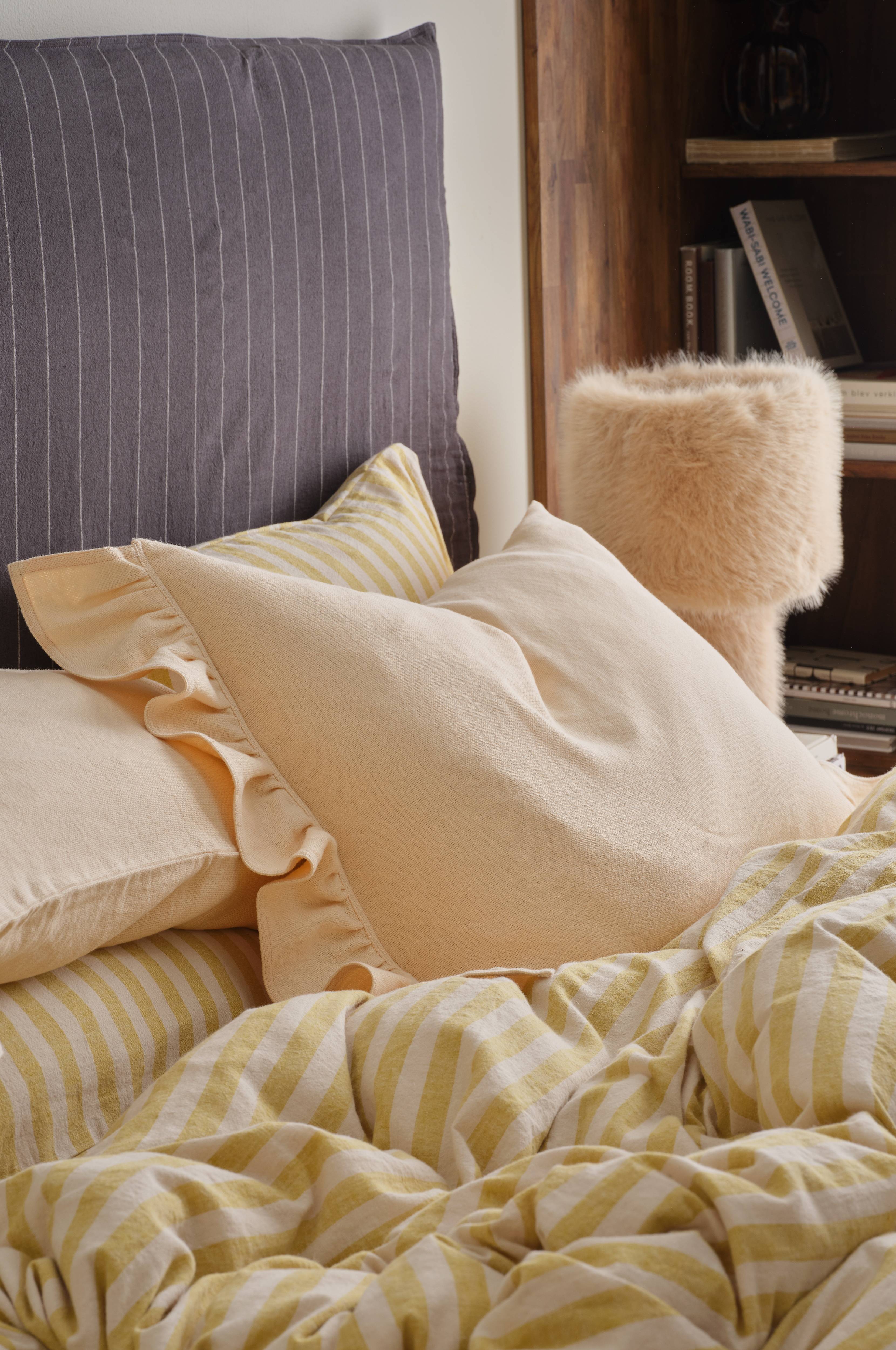 Elly är en unik kollektion med genomtänkta och arbetade detaljer, där du hittar både bäddtextil, gardiner, kökstextil och mysplagg. Kollektionen låter dig skapa din egen personliga mix där du enkelt kan kombinera alla delar – enfärgat, rutigt, randigt och mönstrat. Kvaliteten är en mix av återvunnet lin och bomull.