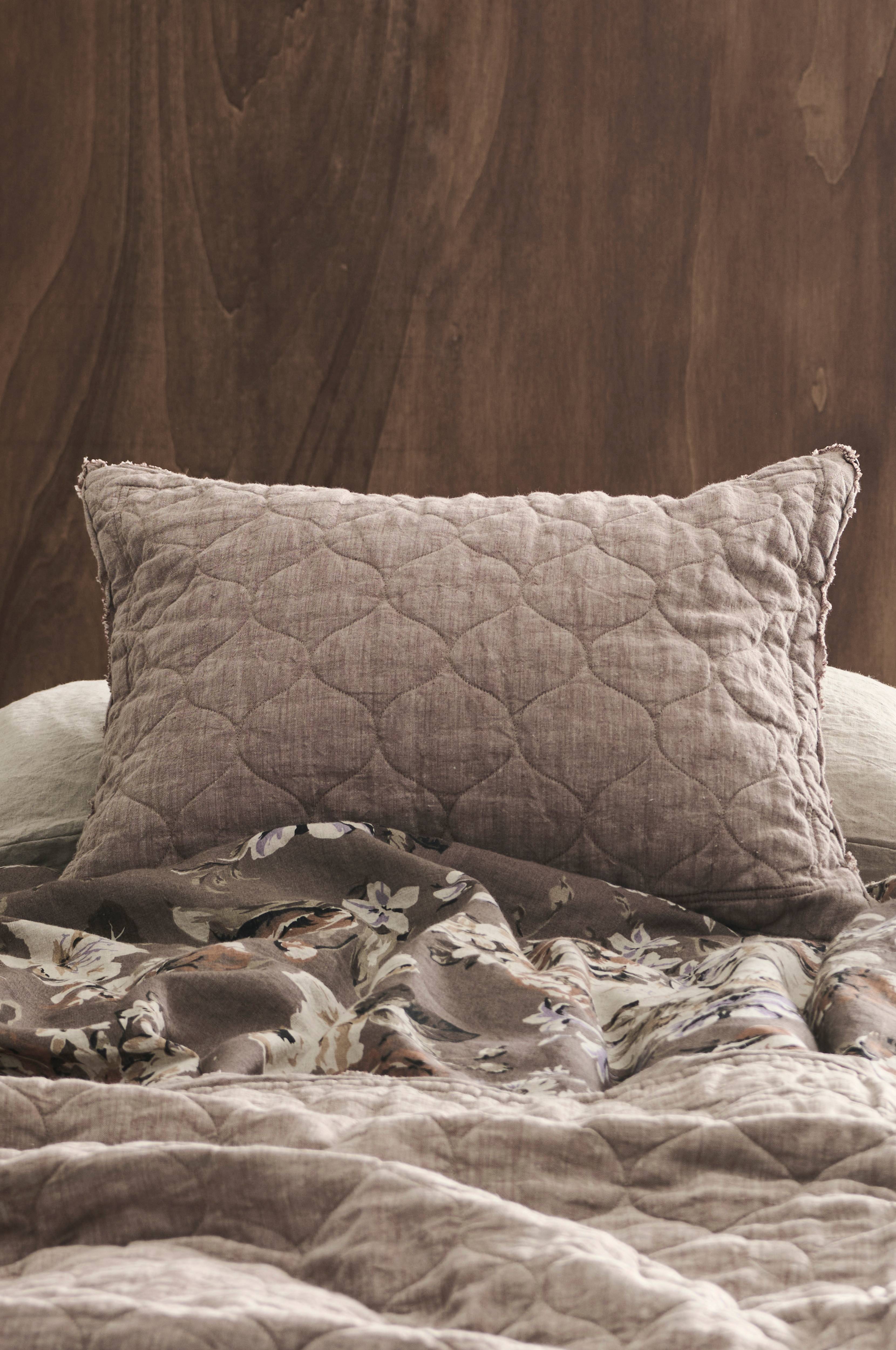 Kuddfodral i tvättad och garnfärgad chambray av lin. Quiltat mönster, rå kant och vaddering av 100% polyester. Baksida av enfärgad bomull. Stl 50x60 cm.