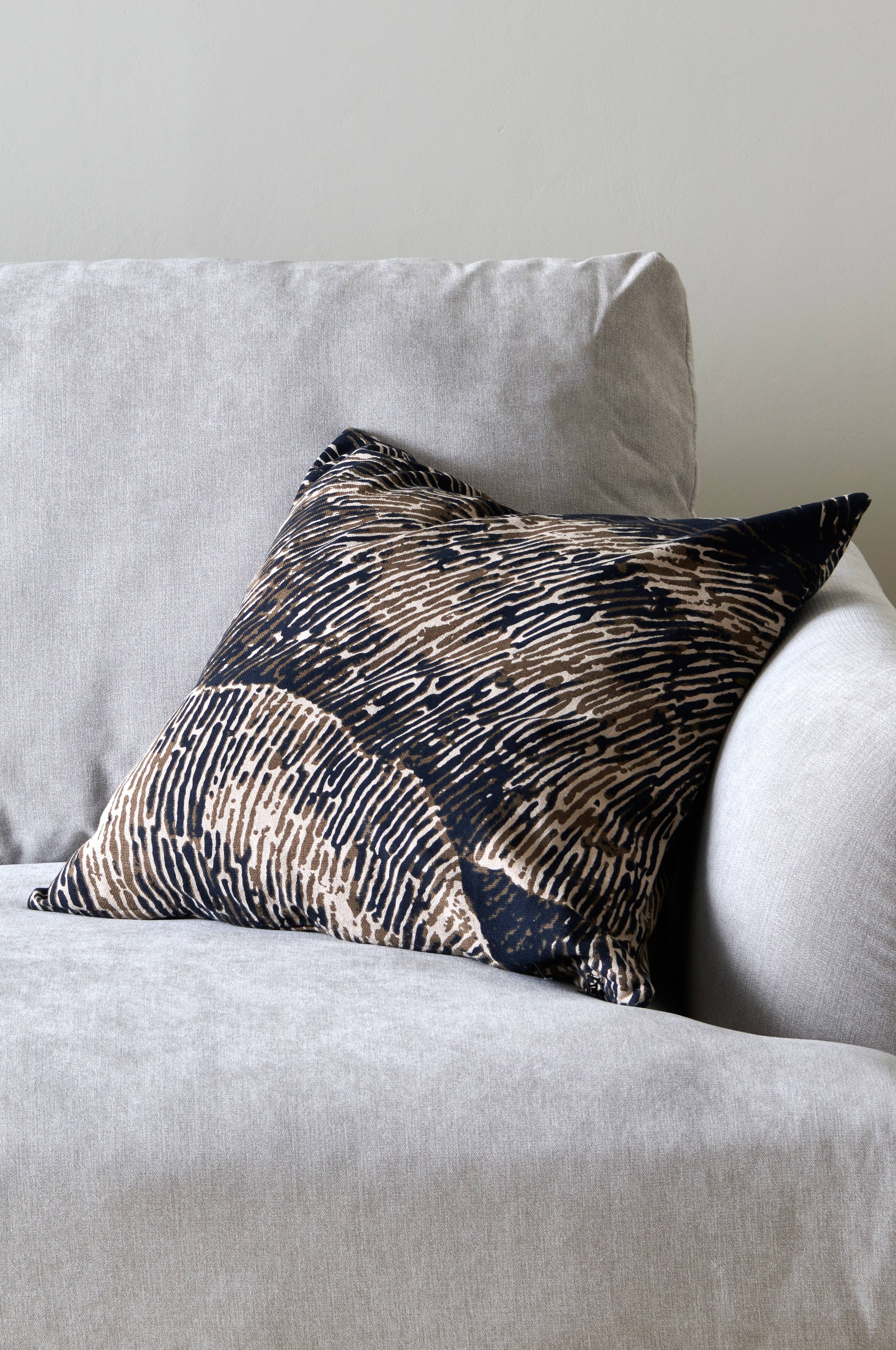 Kuddfodral av bomull i lite grövre halvpanama. Tryck på fram- och baksida. Dragkedja i botten.