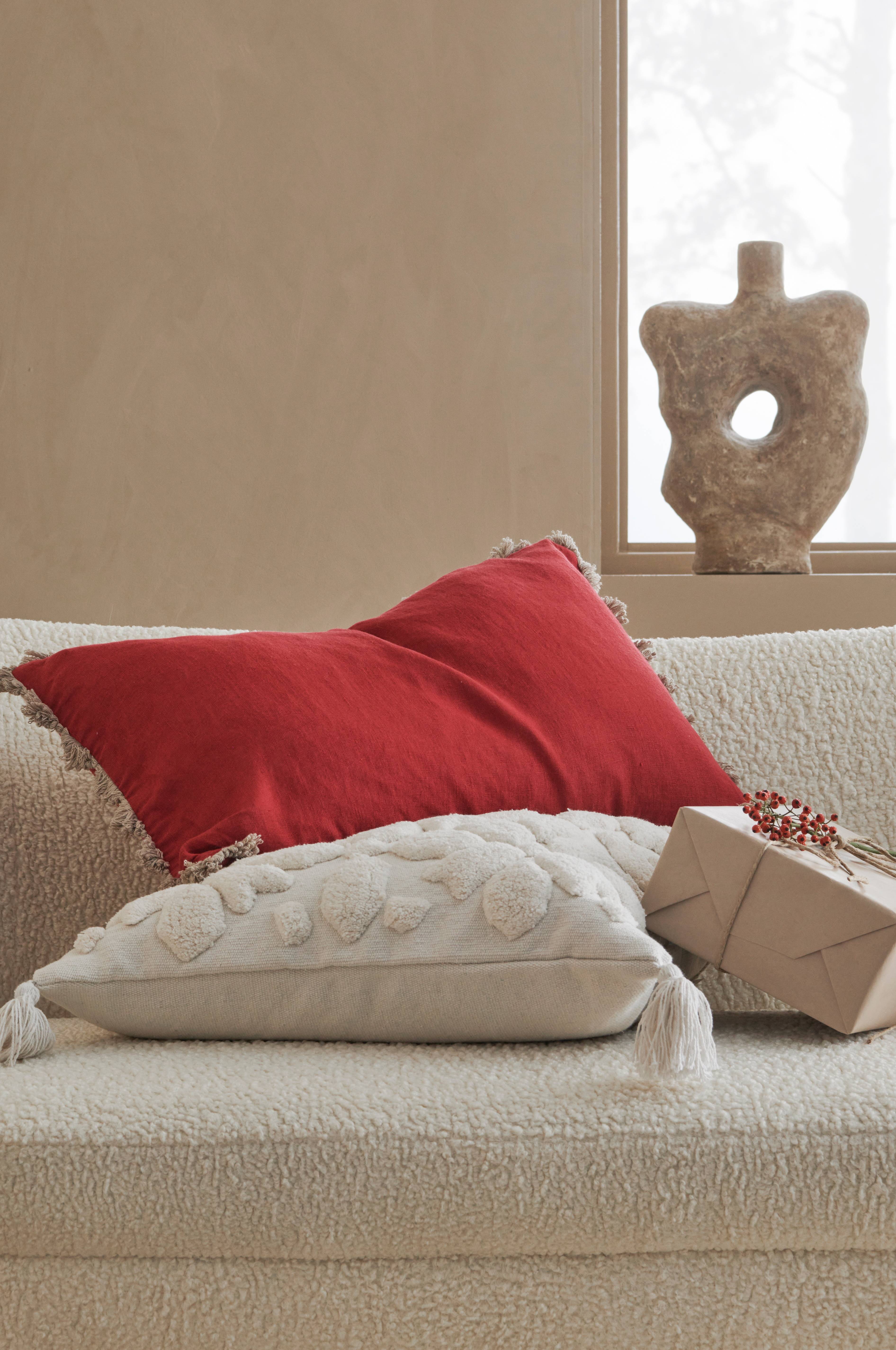Kuddfodral av lin med dekorativ kant i garn runt om. Enfärgad på båda sidorna. Dold dragkedja på baksidan.