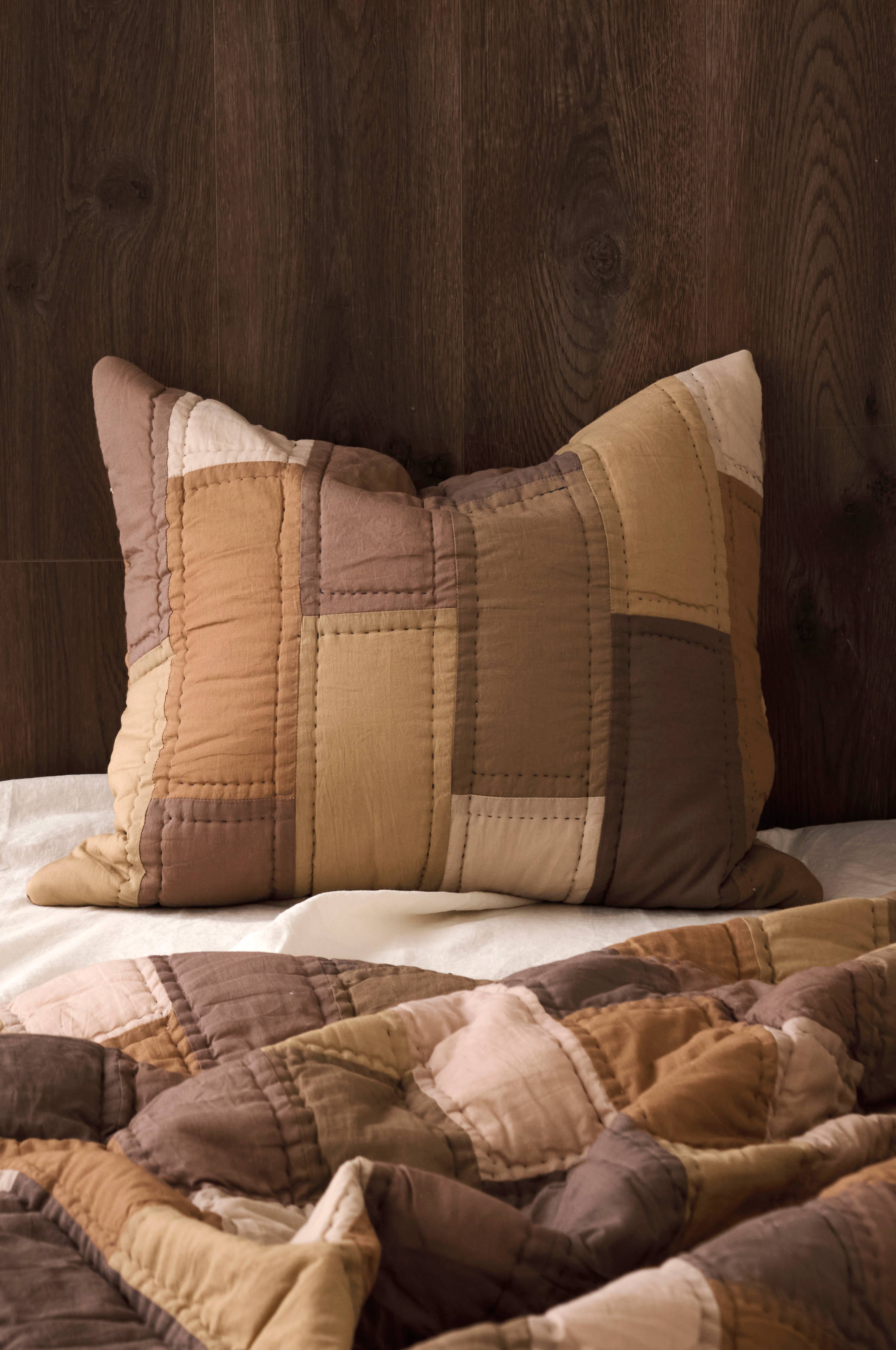 Handquiltat kuddfodral med lapptäckmönster på båda sidorna. Av mjuk, tvättad bomullsvoile. Fyllning av 250 g bomull. Dragkedja. Stl 50x60 cm.