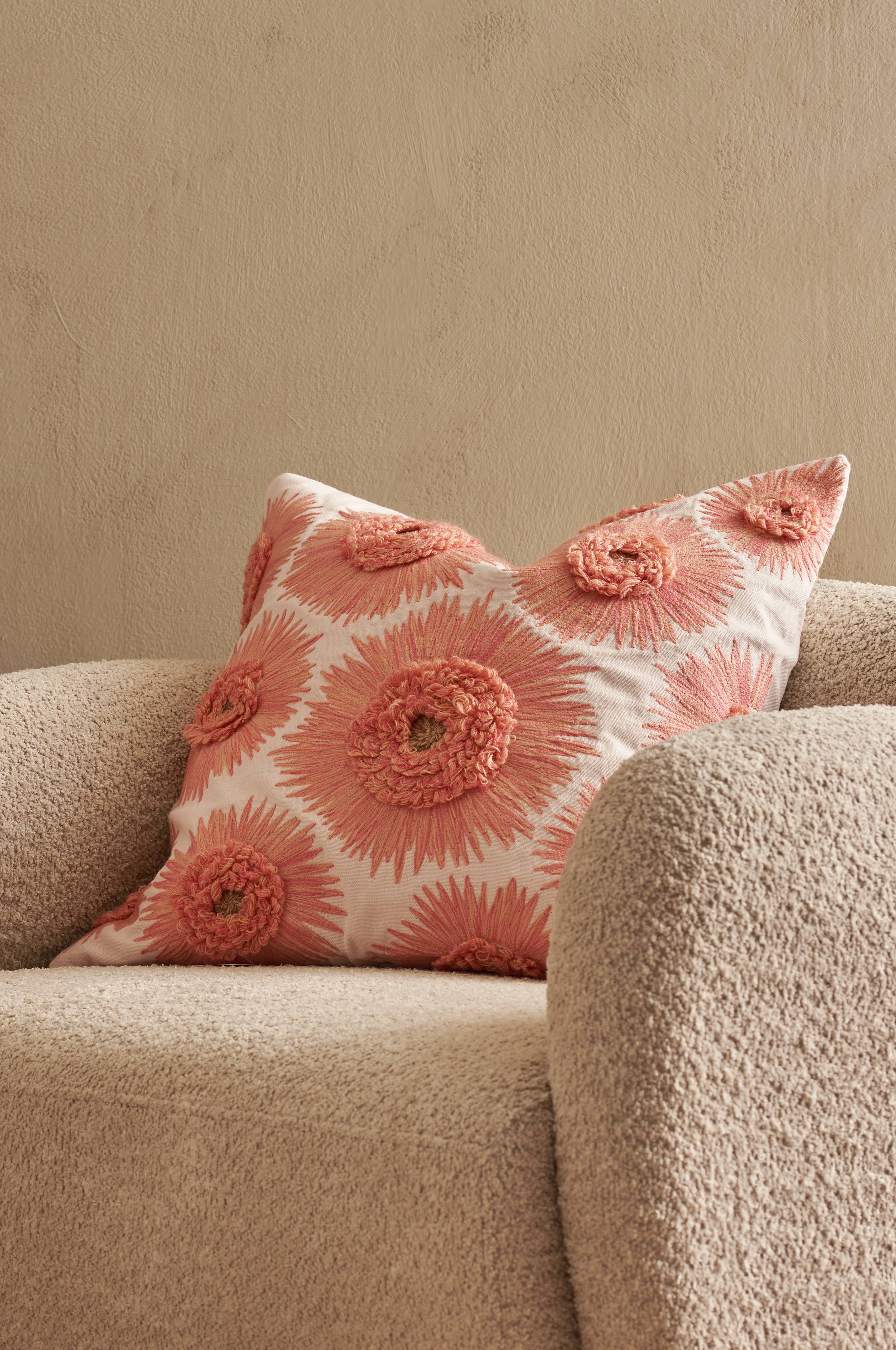Kuddfodral i lite kraftigare halvpanama av bomull. Broderade blommor på framsidan. Dragkedja i botten.