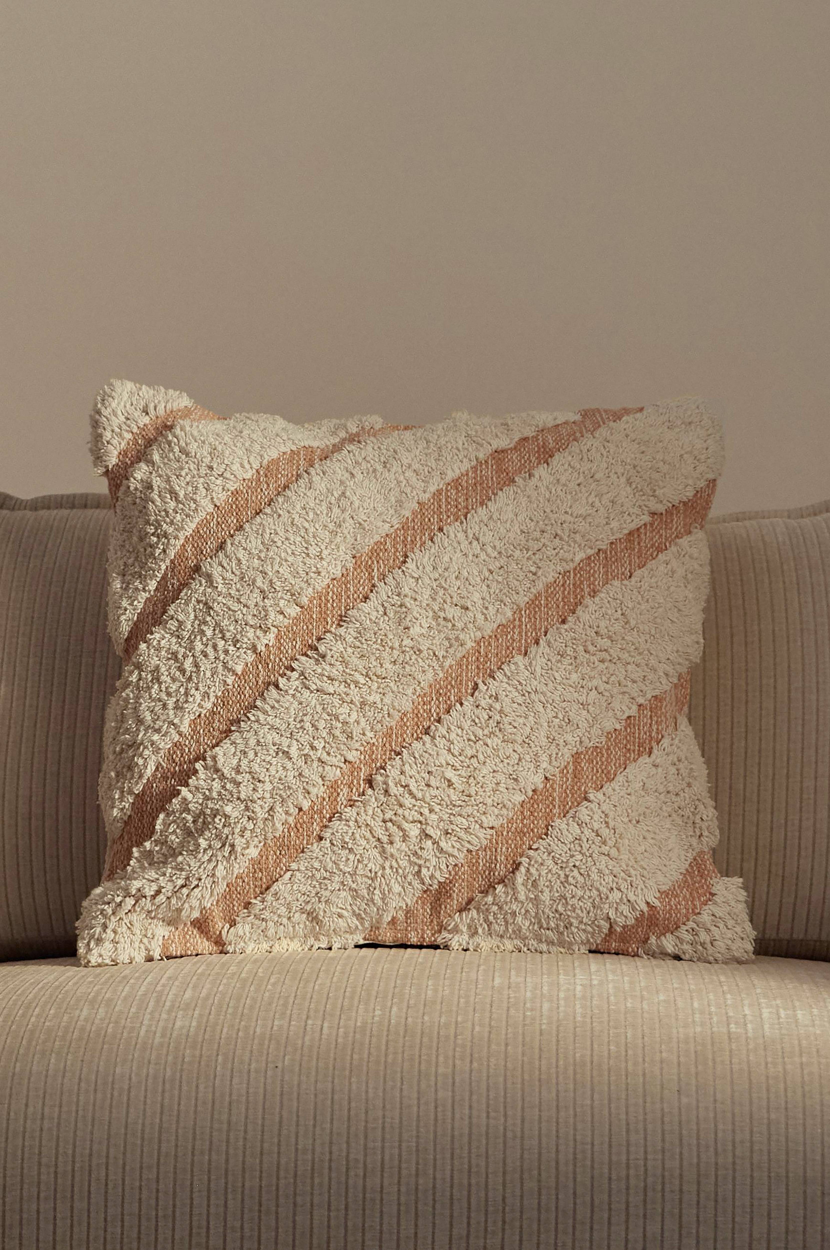• Kuddfodral med grov, melerad struktur i botten och tuftat mönster