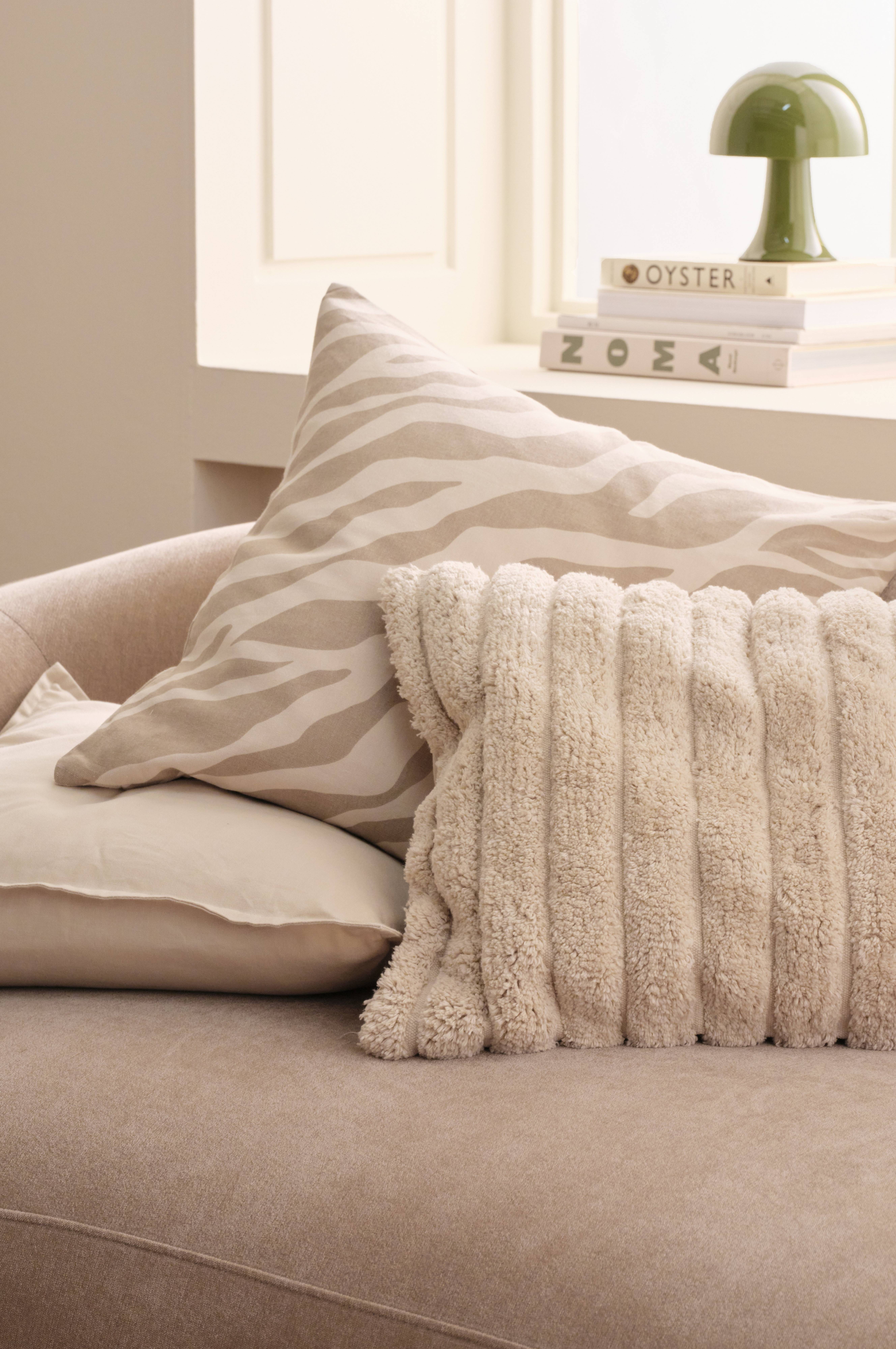 Kuddfodral 1: Av grov bomull med tuftat mönster. Baksida i halvpanama. Dragkedja på baksidan. 60x40 cm. Kuddfodral 2: Av lite kraftigare halvpanama med tryck på på båda sidorna. Dragkedja i botten. 50x50 cm. Kuddfodral 3: Enfärgad bomull med liten vinge runt om. Dragkedja på baksidan. 50x50 cm