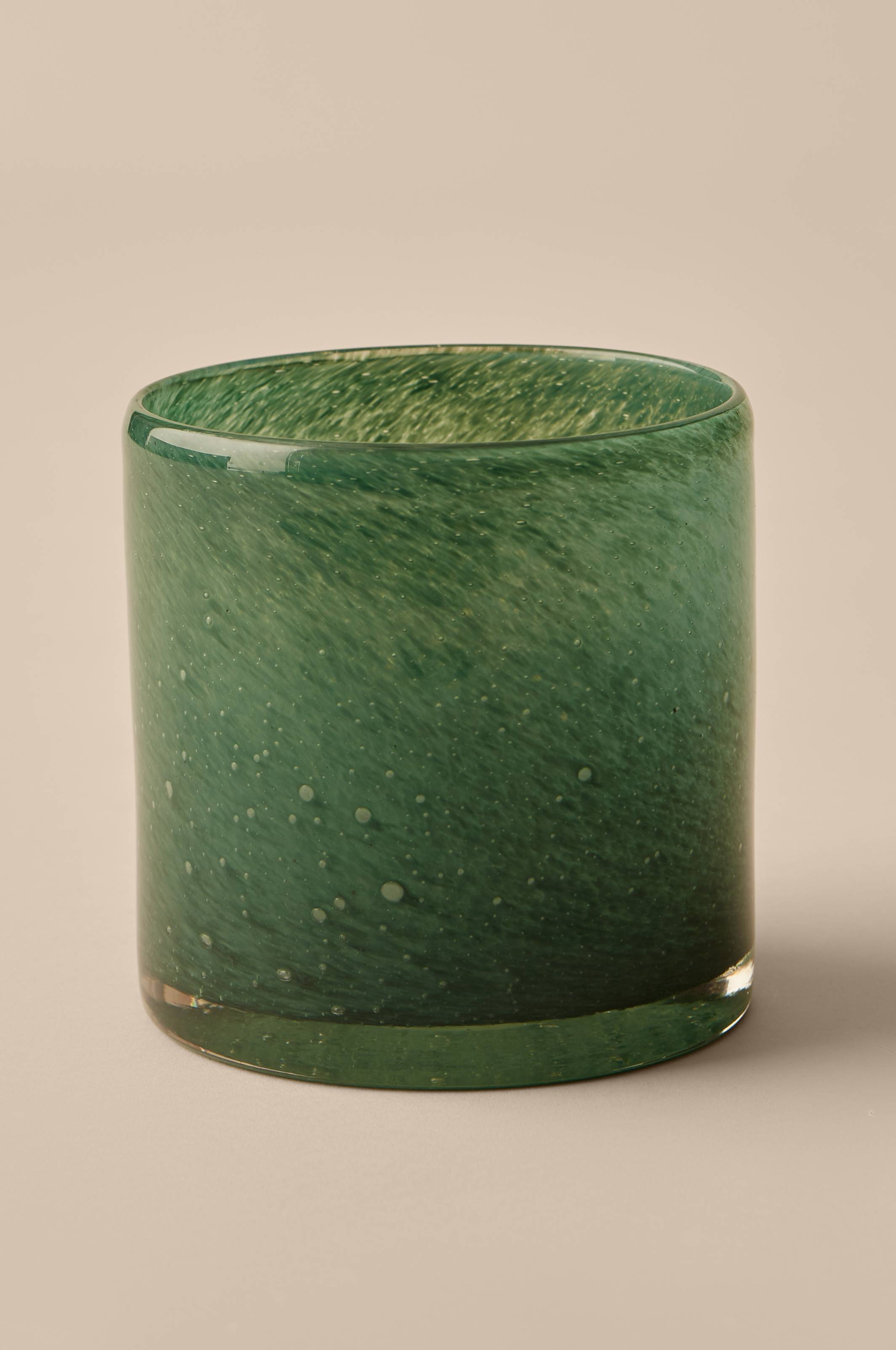 Ljuslykta eller liten kruka i glas. Färgen har vackra skiftningar och glaset har bubblor i sig som skapar fint uttryck och ett stämningsfullt ljussken. Tekniken gör att ojämnheter och färgskillnader förekommer och varje ljuslykta blir unik. Höjd ca 15 cm, Ø ca 15 cm. Rengörs för hand.