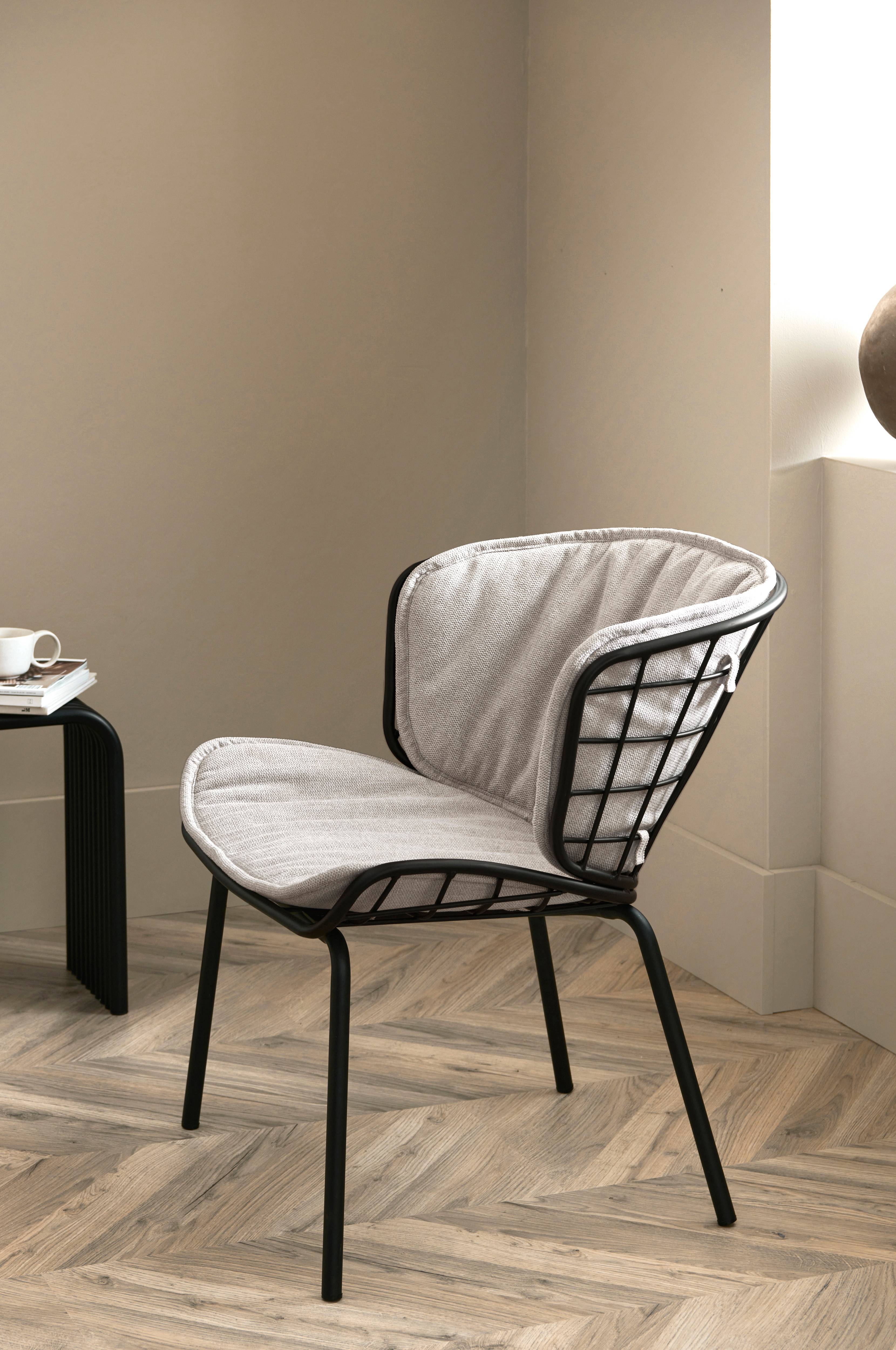 Stol av pulverlackad metall. Avtagbar, lätt vadderad dyna med yttertyg i polyester, Martindale >21000. Skumfyllning. Sits och rygg är i rutmönstrad metall. Levereras monterad.