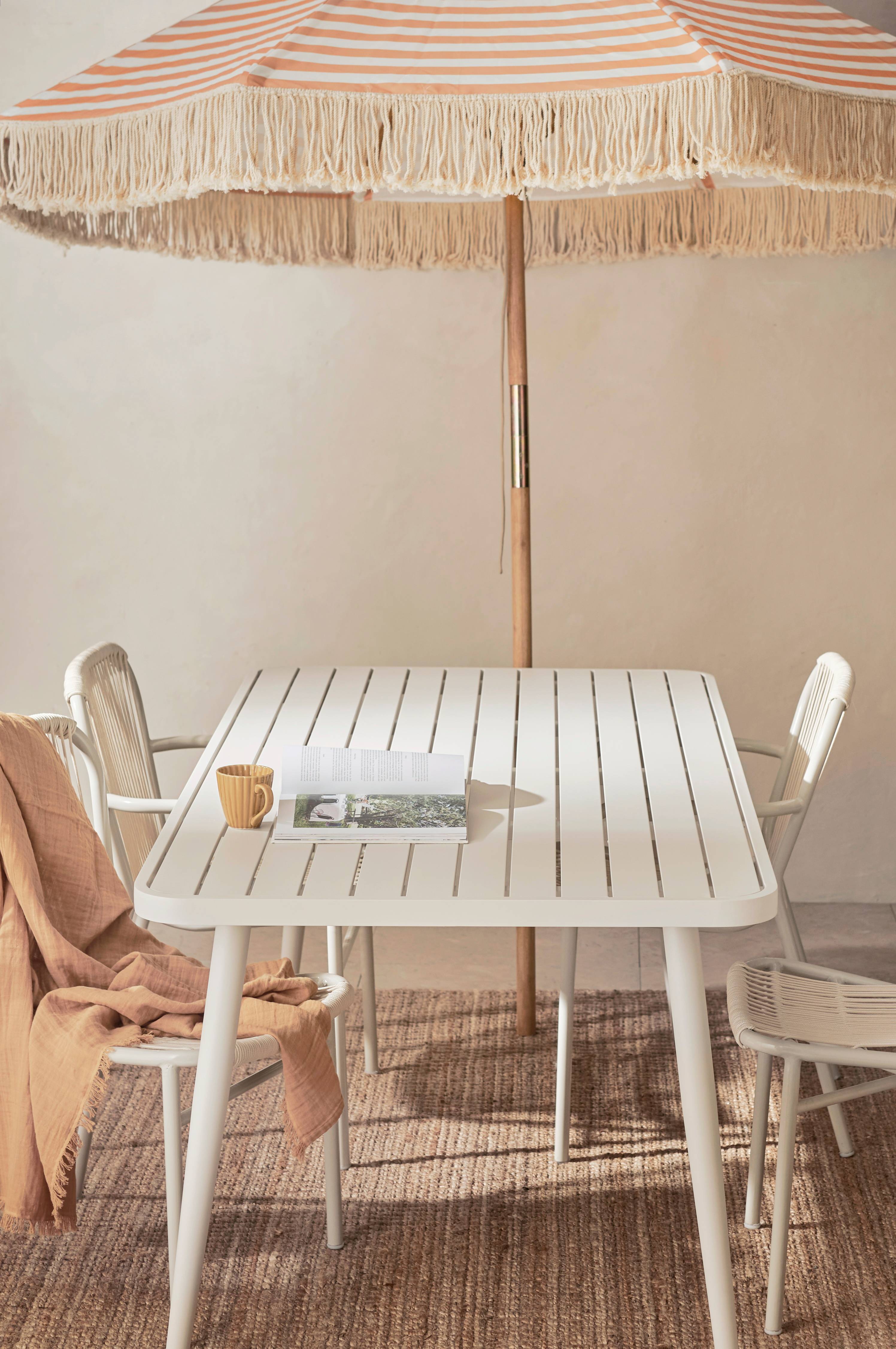 Matbord i aluminium med ribbad toppskiva. Kan användas utomhus.