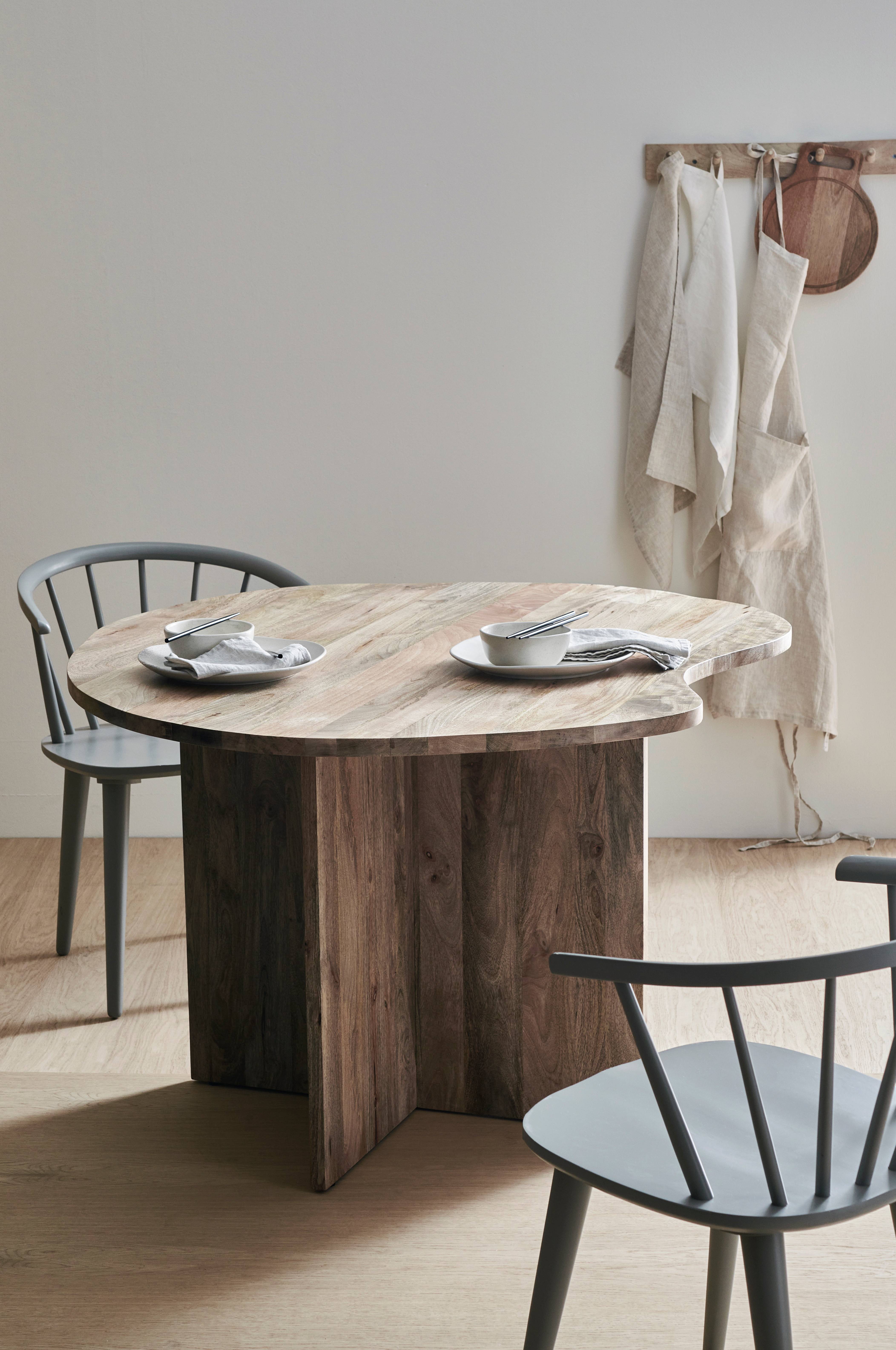 Matbord i mangoträ med vaxad yta. Toppskiva med oregelbunden, organisk form.