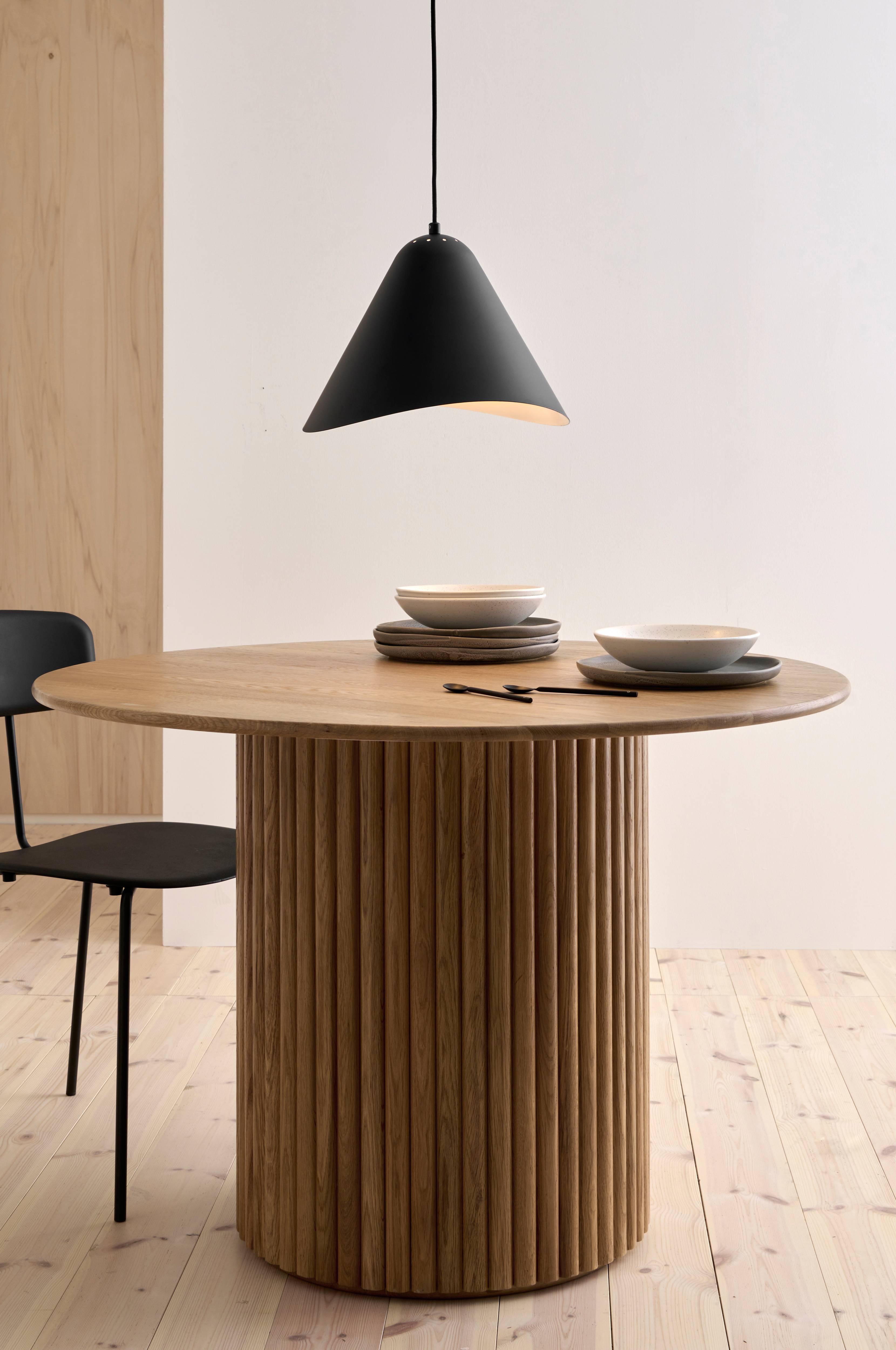 Runt soffbord i massiv ek. Toppskiva med rundade kanter. Rund, stabil bas i massivt trä och MDF med monterade stavar runt om som ger basen en ribbad struktur. Behandlat med vattenbaserat lack. Höjd 75 cm, diameter på toppskivan ca 110 cm. Diameter på basen 51 cm. Levereras omonterat.