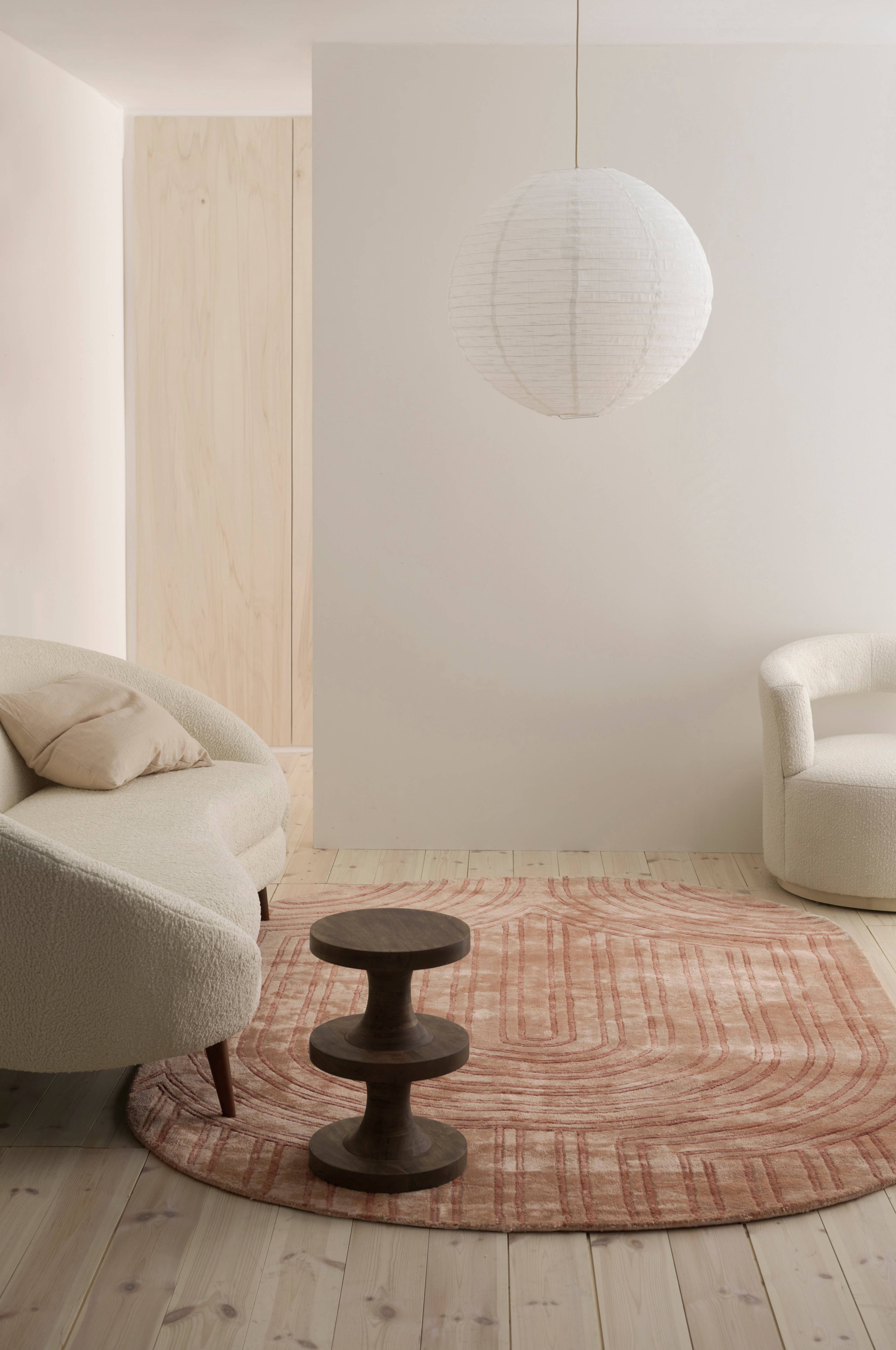 Handtuftad matta i skimrande viskos. Mönster ton-i-ton med runda former.