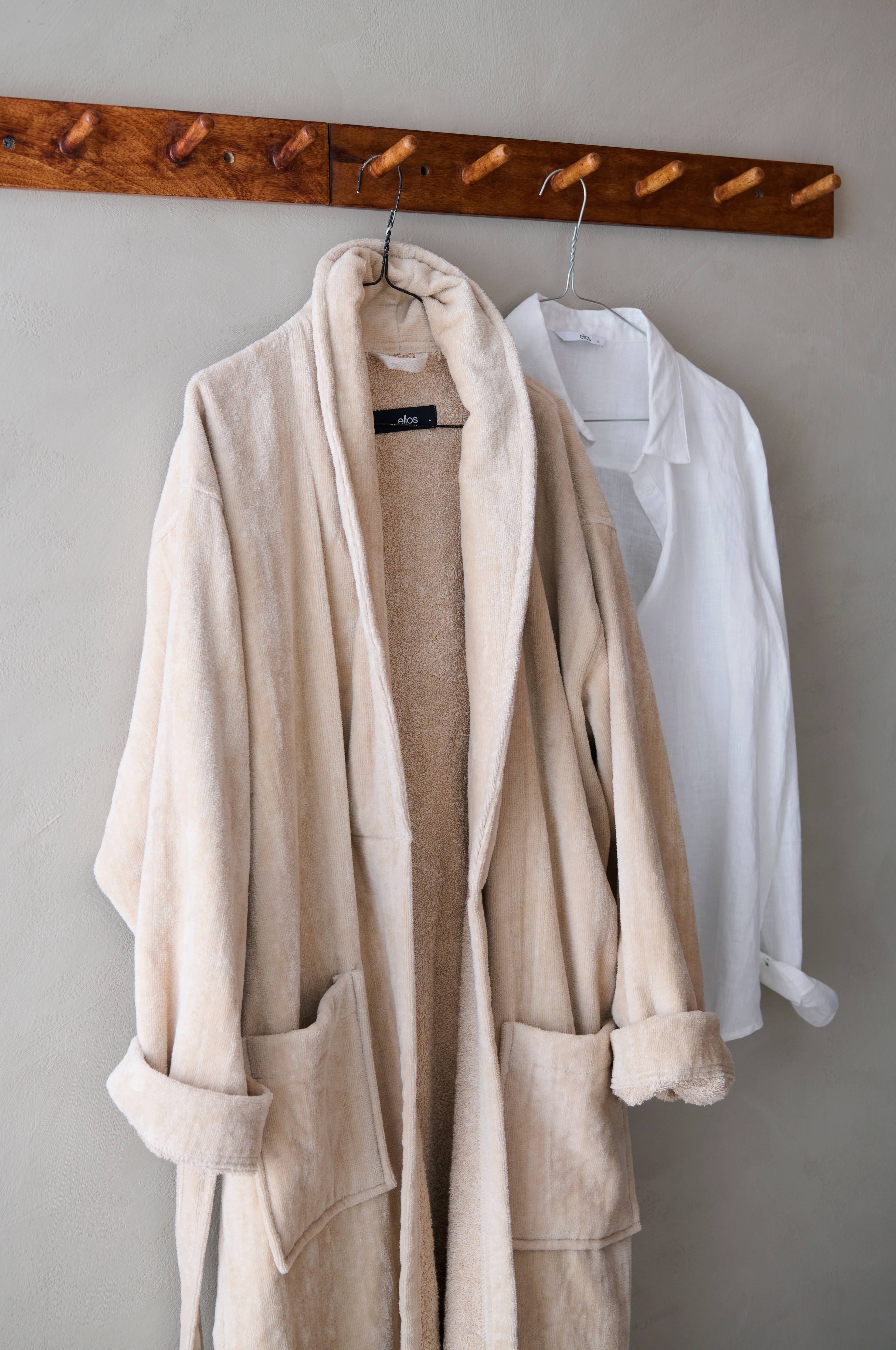 Klassisk morgonrock med knytskärp i midjan och två fickor fram. Insida i frotté och slät, mjuk utsida. Längd ca 120 cm i stl M.