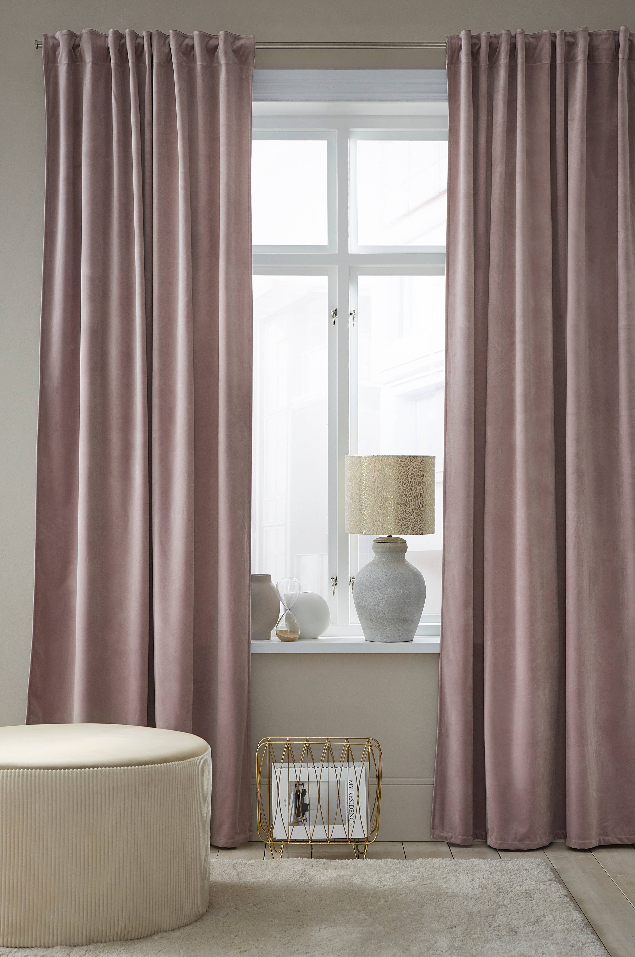 Mörkläggningsgardin av mjuk sammet med ett vävt mellanlager med invävda svarta trådar gör att gardinen avskärmar ljuset. Med multiband som gör att du antingen kan hänga gardinen direkt på en gardinstång genom de gömda hällorna eller använda ringar och nålkrokar (ej fingerkrokar). Snören i rynkbandet gör att du lätt kan skapa jämna, fina veck. Bredd 132 cm. Tre längder: 220, 250 och 300 cm. Säljs i 1-pack.
