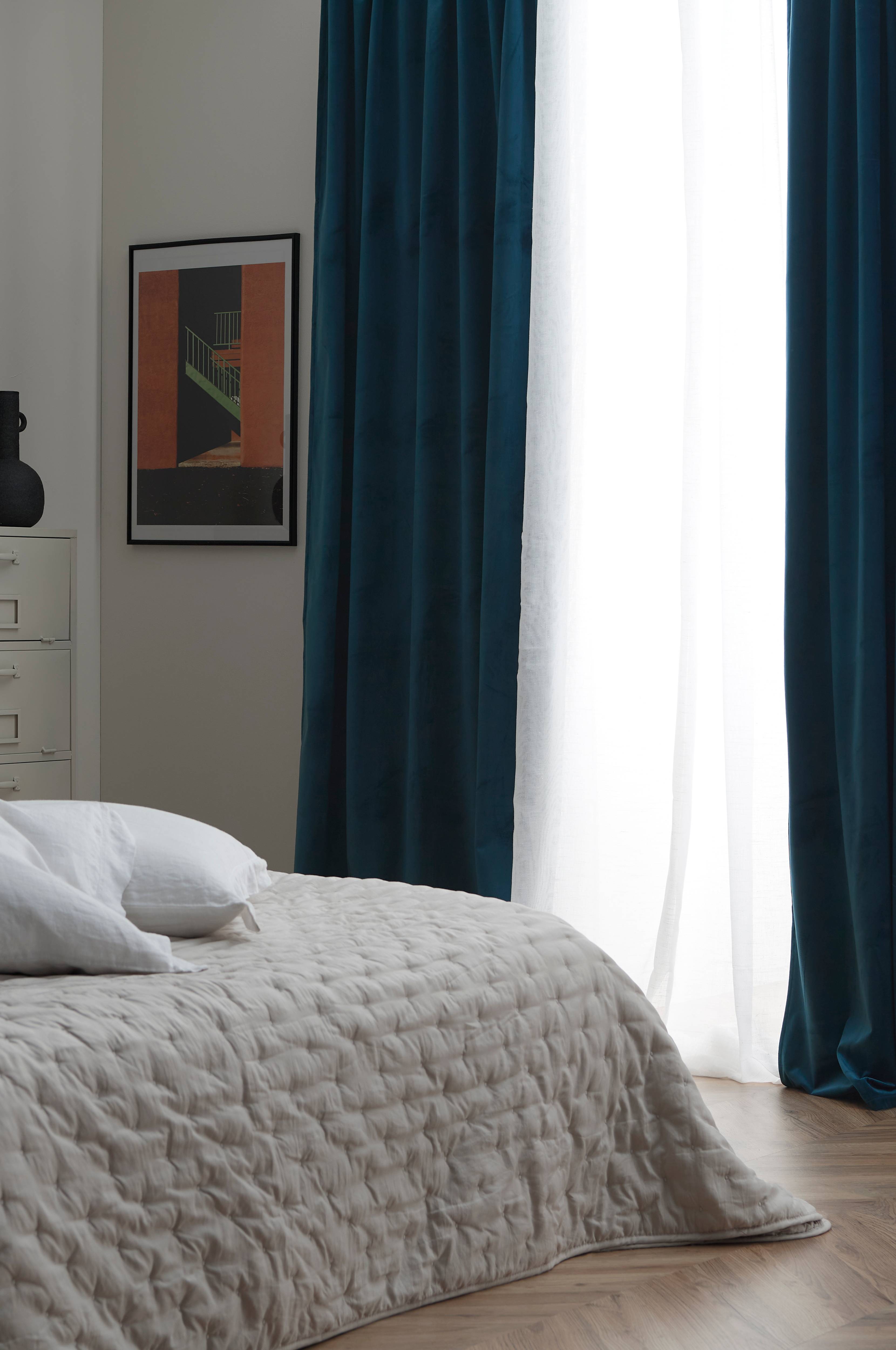 Mörkläggningsgardin av mjuk sammet med ett vävt mellanlager med invävda svarta trådar gör att gardinen avskärmar ljuset. Med multiband som gör att du antingen kan hänga gardinen direkt på en gardinstång genom de gömda hällorna eller använda ringar och nålkrokar (ej fingerkrokar). Snören i rynkbandet gör att du lätt kan skapa jämna, fina veck. Bredd 132 cm. Tre längder: 220, 250 och 300 cm. Säljs i 1-pack.