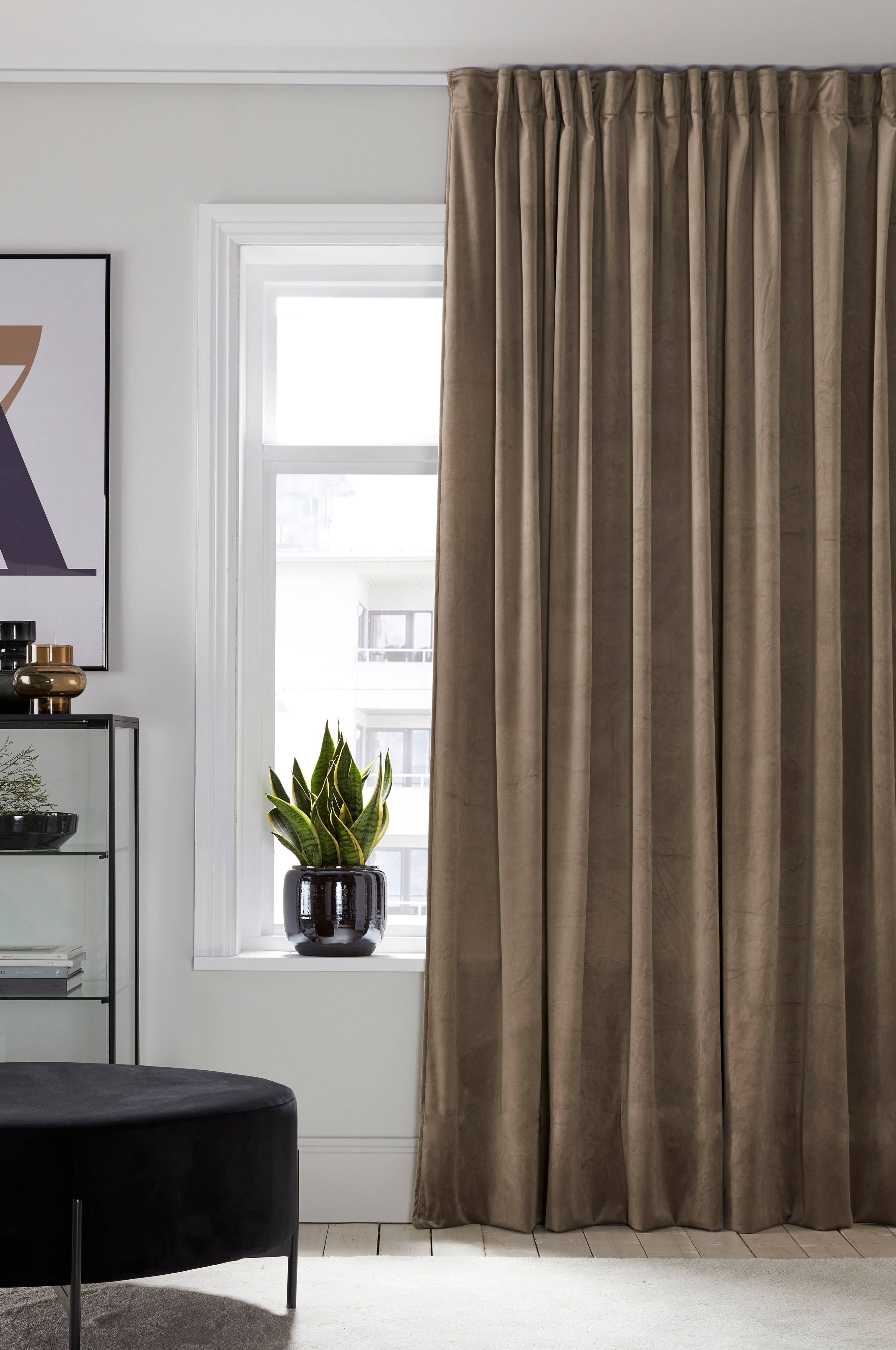 Mörkläggningsgardin av mjuk sammet med ett vävt mellanlager med invävda svarta trådar som gör att gardinen avskärmar ljuset. Med multiband som gör att du antingen kan hänga gardinen direkt på en gardinstång genom de gömda hällorna eller använda ringar och nålkrokar (ej fingerkrokar). Snören i rynkbandet gör att du lätt kan skapa jämna, fina veck. Bredd 270 cm. Längd 300 cm. Säljs i 1-pack.