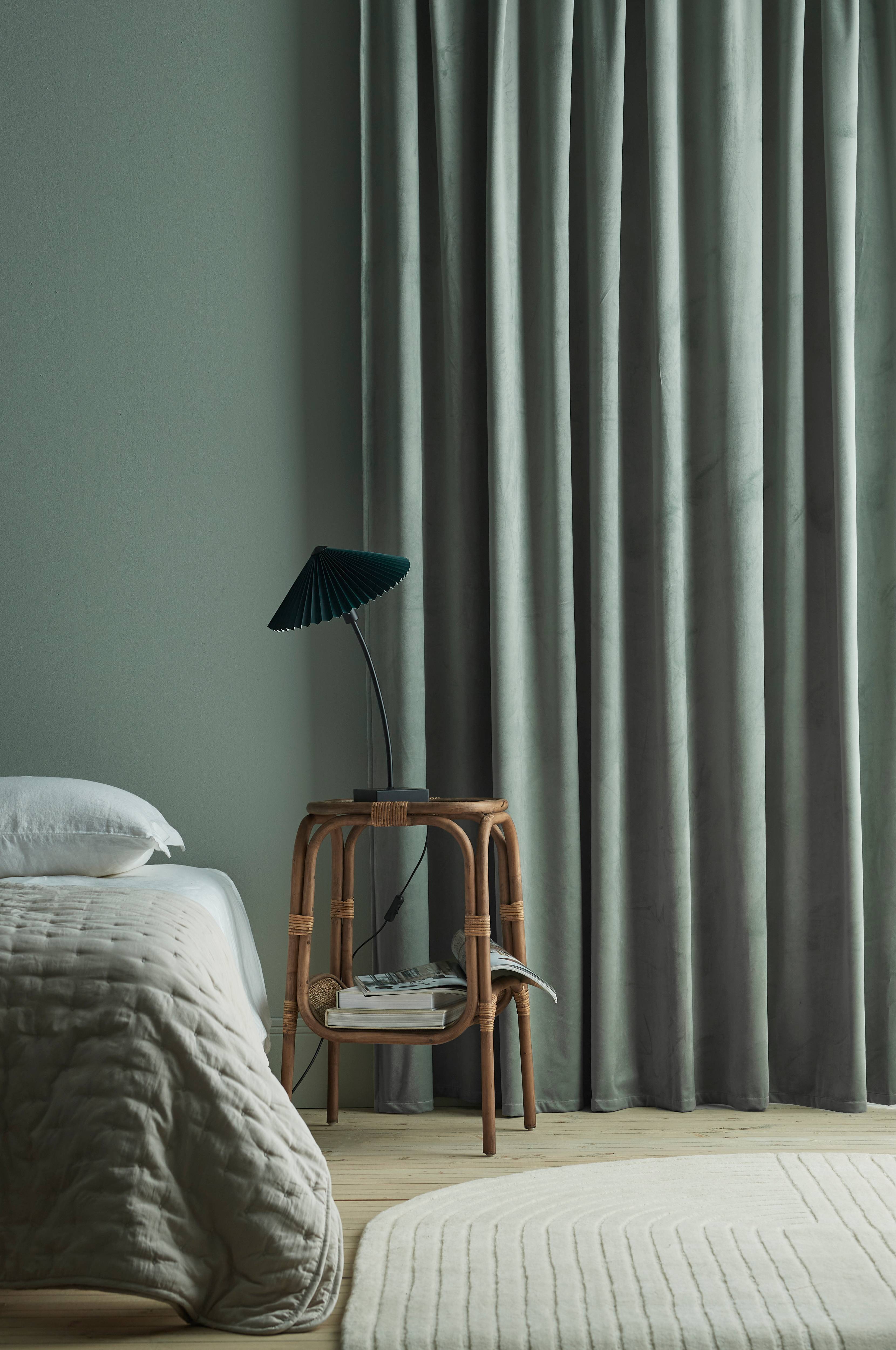 Mörkläggningsgardin av mjuk sammet med ett vävt mellanlager med invävda svarta trådar som gör att gardinen avskärmar ljuset. Med multiband som gör att du antingen kan hänga gardinen direkt på en gardinstång genom de gömda hällorna eller använda ringar och nålkrokar (ej fingerkrokar). Snören i rynkbandet gör att du lätt kan skapa jämna, fina veck. Bredd 270 cm. Längd 300 cm. Säljs i 1-pack.