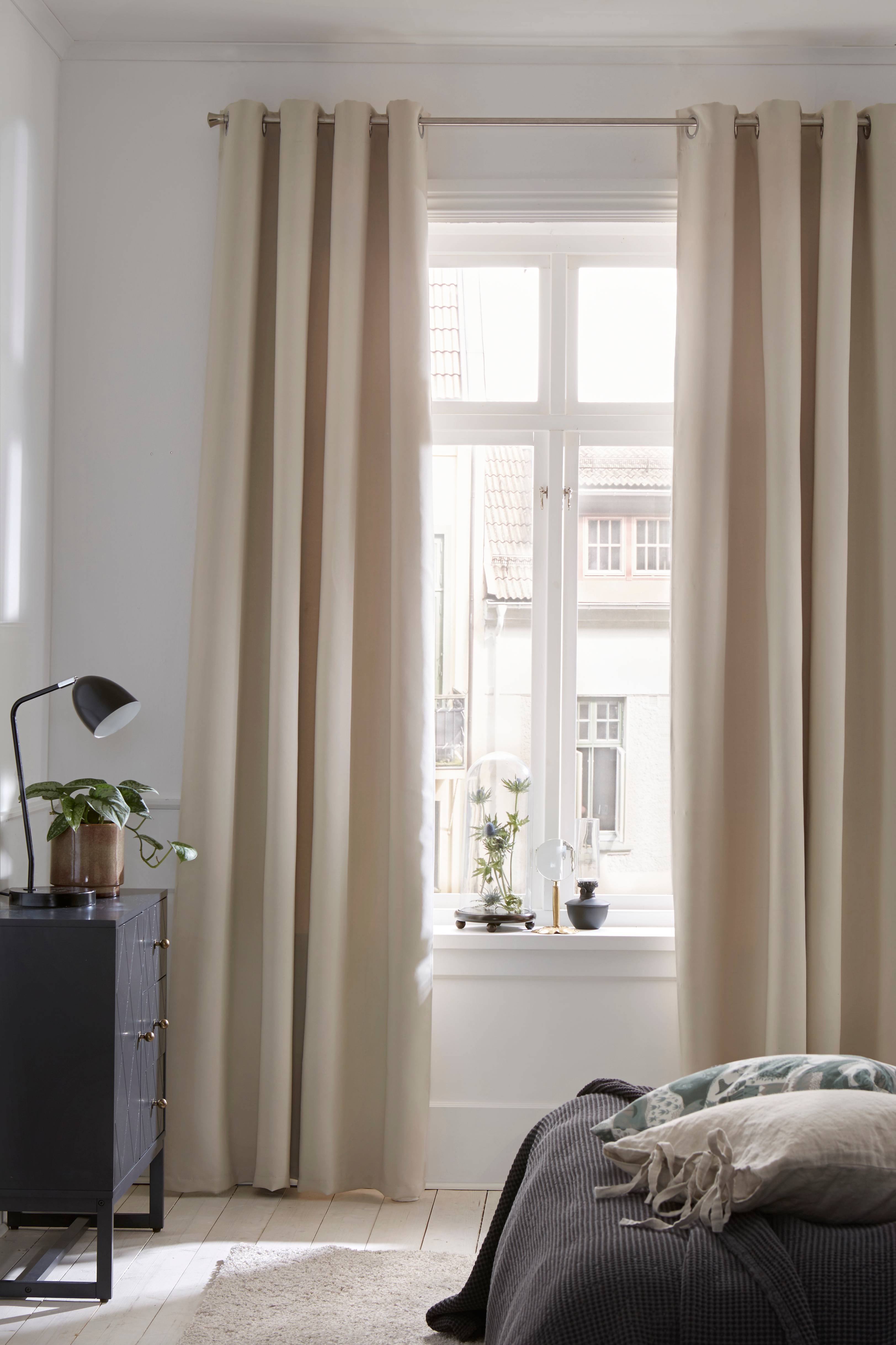 Mörkläggningsgardin med öljetter i silverfärgad metall. Ett vävt mellanlager med invävda svarta trådar gör att gardinen skärmar av ljuset. Matchande färg ton-i-ton på baksidan. Bredd 140 cm. 2 längder: 220 och 250 cm. 1 längd/förpackning.