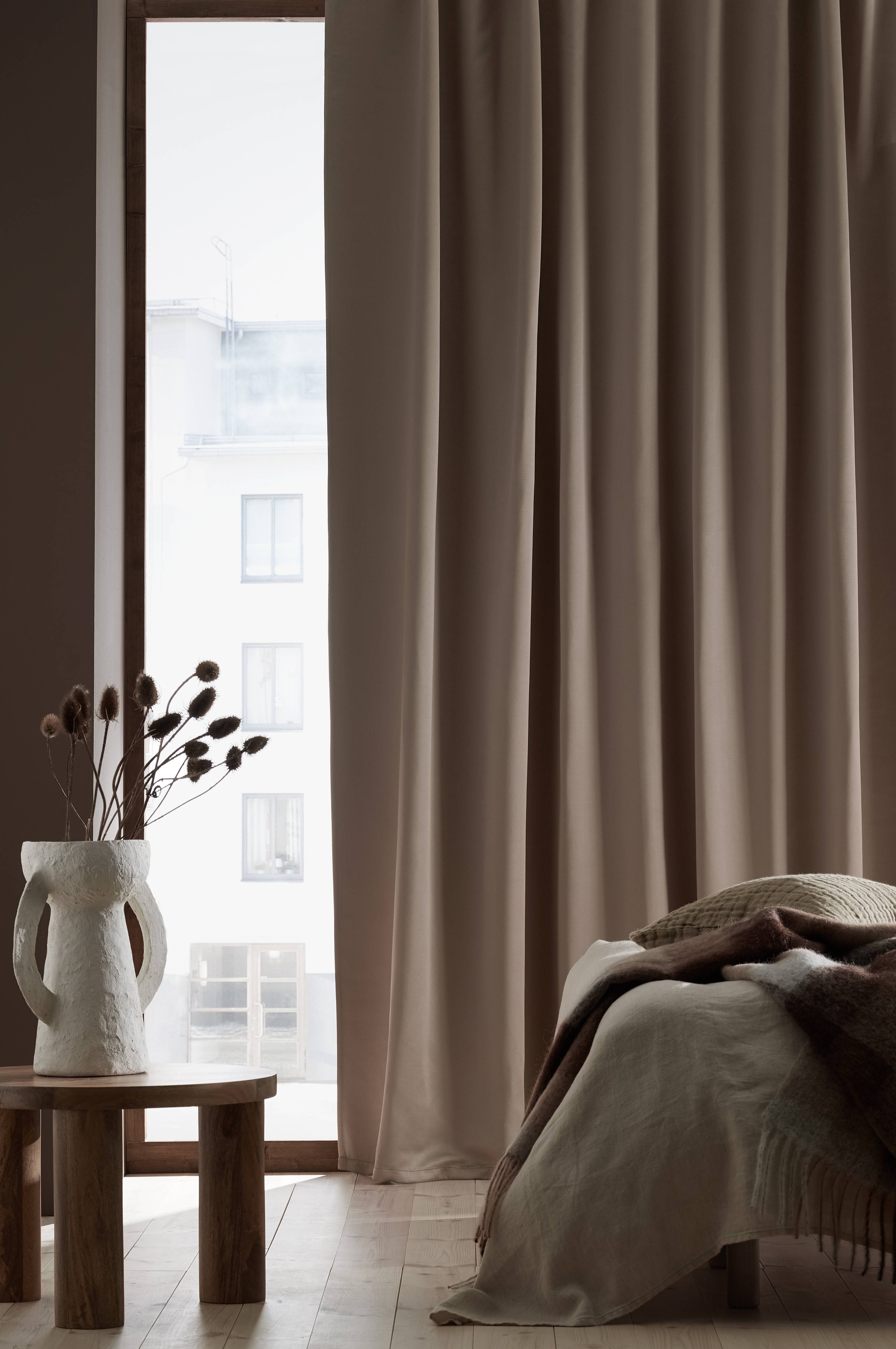 Mörkläggningsgardin i twill med fin lyster. Ett vävt mellanlager med invävda svarta trådar gör att gardinen skärmar av ljuset. Gardinen har multiband, som gör att du antingen kan trä den direkt på en gardinstång eller använda ringar och nålkrokar (ej fingerkrokar). Snören i rynkbandet gör att du lätt kan skapa jämna, fina veck. Bredd 270 cm. Längd 300 cm. Säljs i 1-styck.