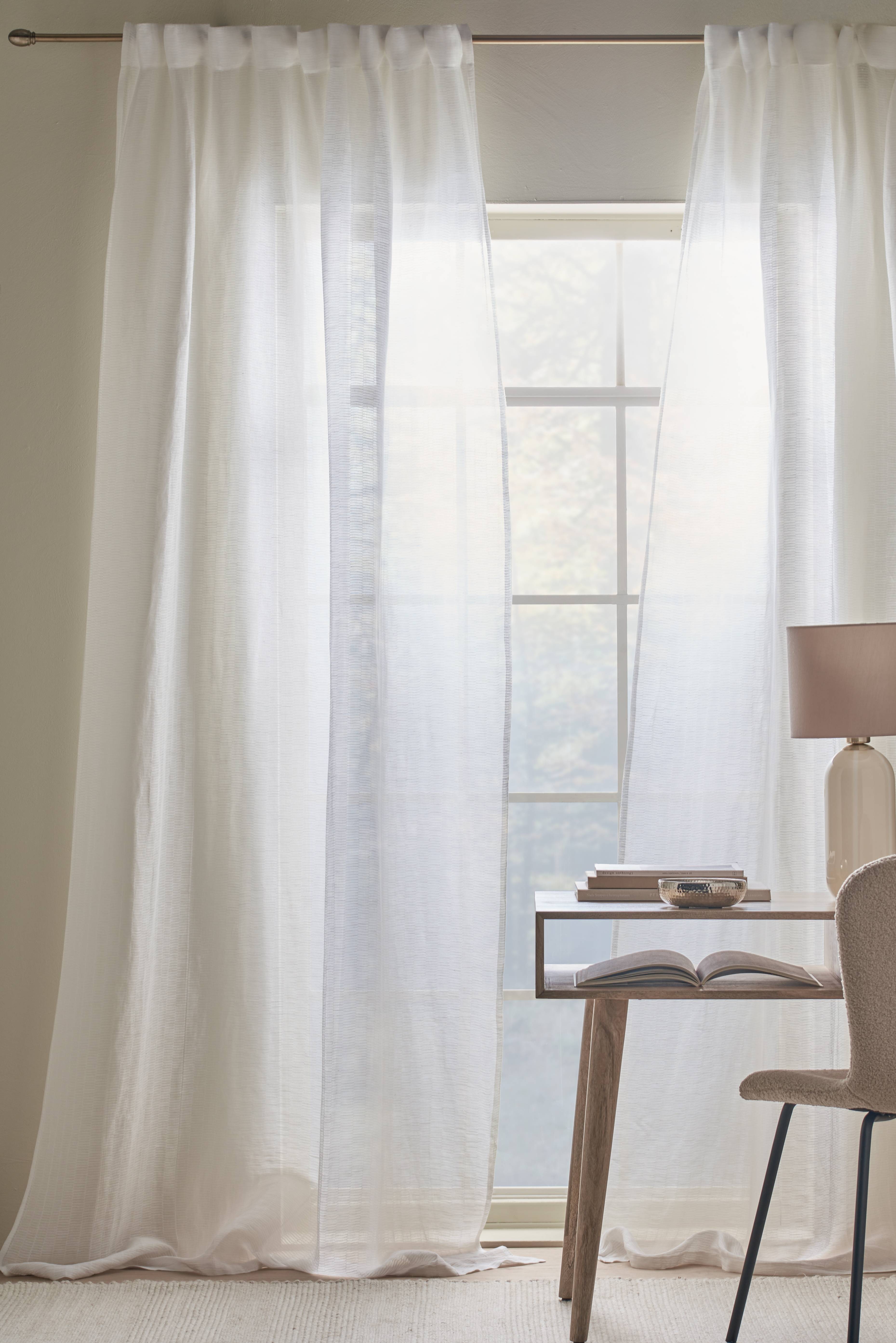 Två multibandslängder i halvtransparent kvalitet med ett vävt mönster som ger en fin, lätt struktur. Multibanden gör att du antingen kan hänga gardinerna direkt på en gardinstång genom de gömda hällorna eller använda ringar, nålkrokar eller fingerkrokar. Snören i rynkbanden gör att du lätt kan skapa jämna, fina veck.