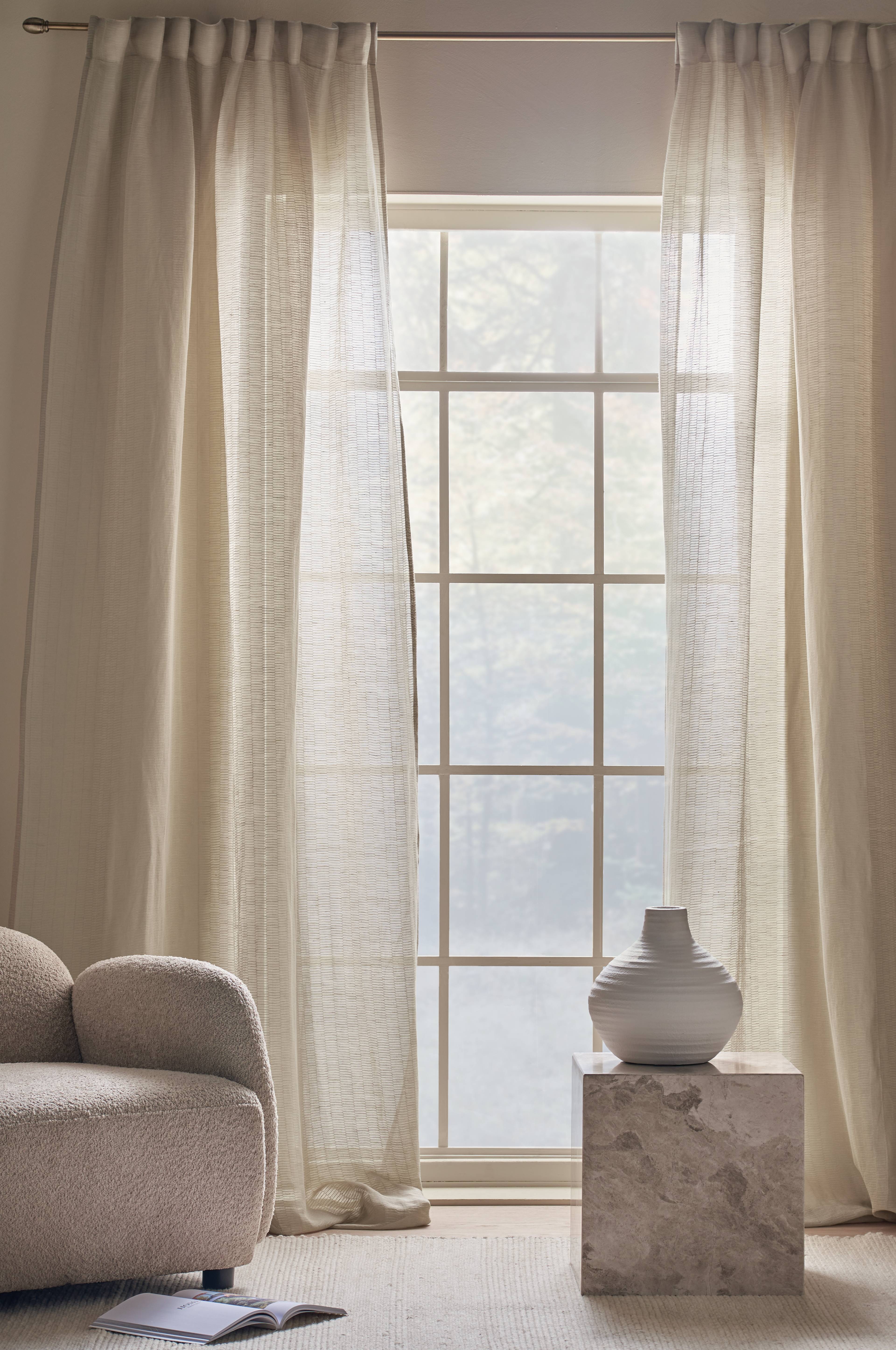Två multibandslängder i halvtransparent kvalitet med ett vävt mönster som ger en fin, lätt struktur. Multibanden gör att du antingen kan hänga gardinerna direkt på en gardinstång genom de gömda hällorna eller använda ringar, nålkrokar eller fingerkrokar. Snören i rynkbanden gör att du lätt kan skapa jämna, fina veck.
