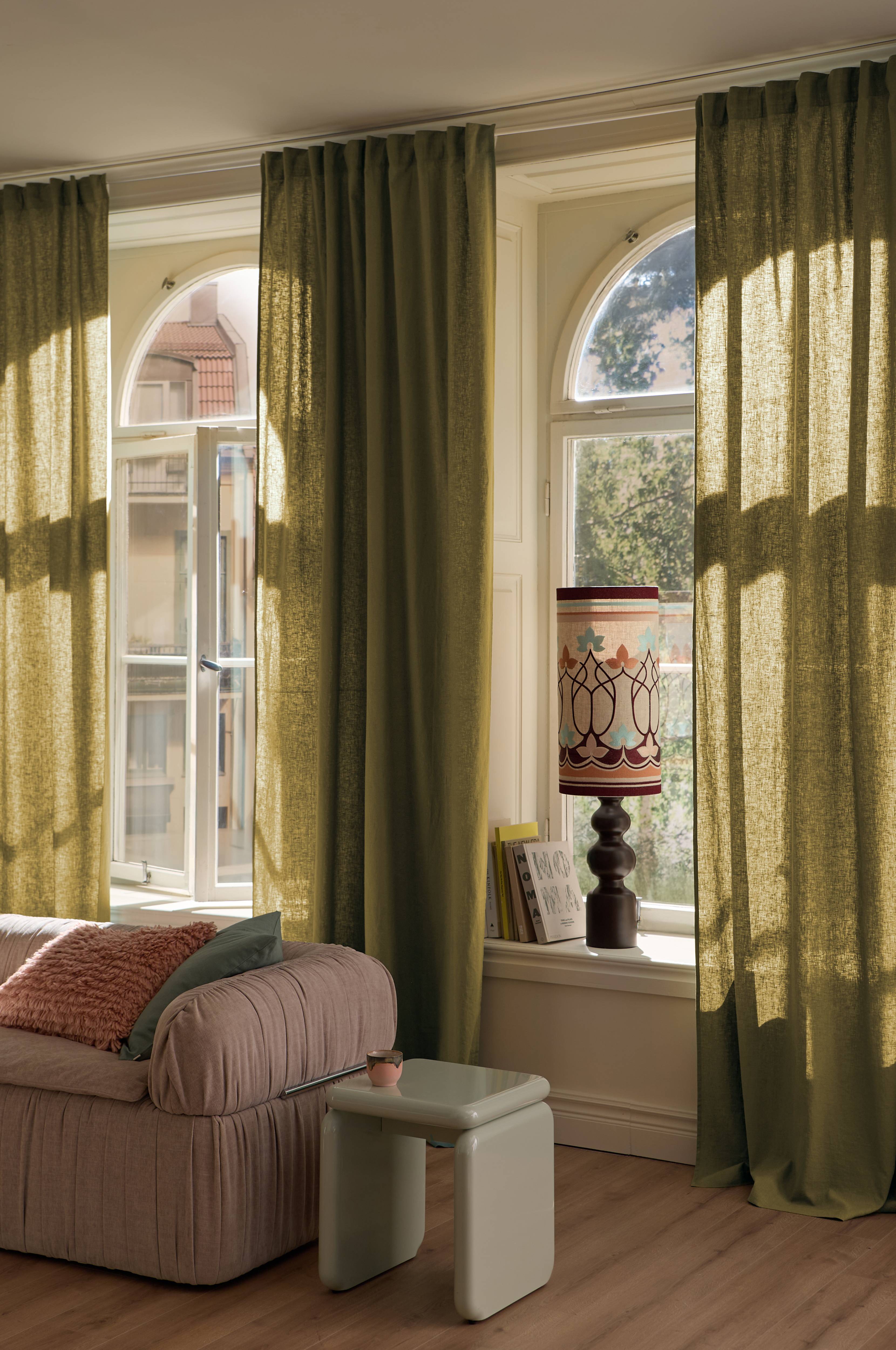 • Multibanden gör att du antingen kan hänga gardinerna direkt på en gardinstång genom de gömda hällorna eller använda ringar, nålkrokar eller fingerkrokar. Snören i rynkbandet gör att du lätt kan skapa jämna, fina veck.