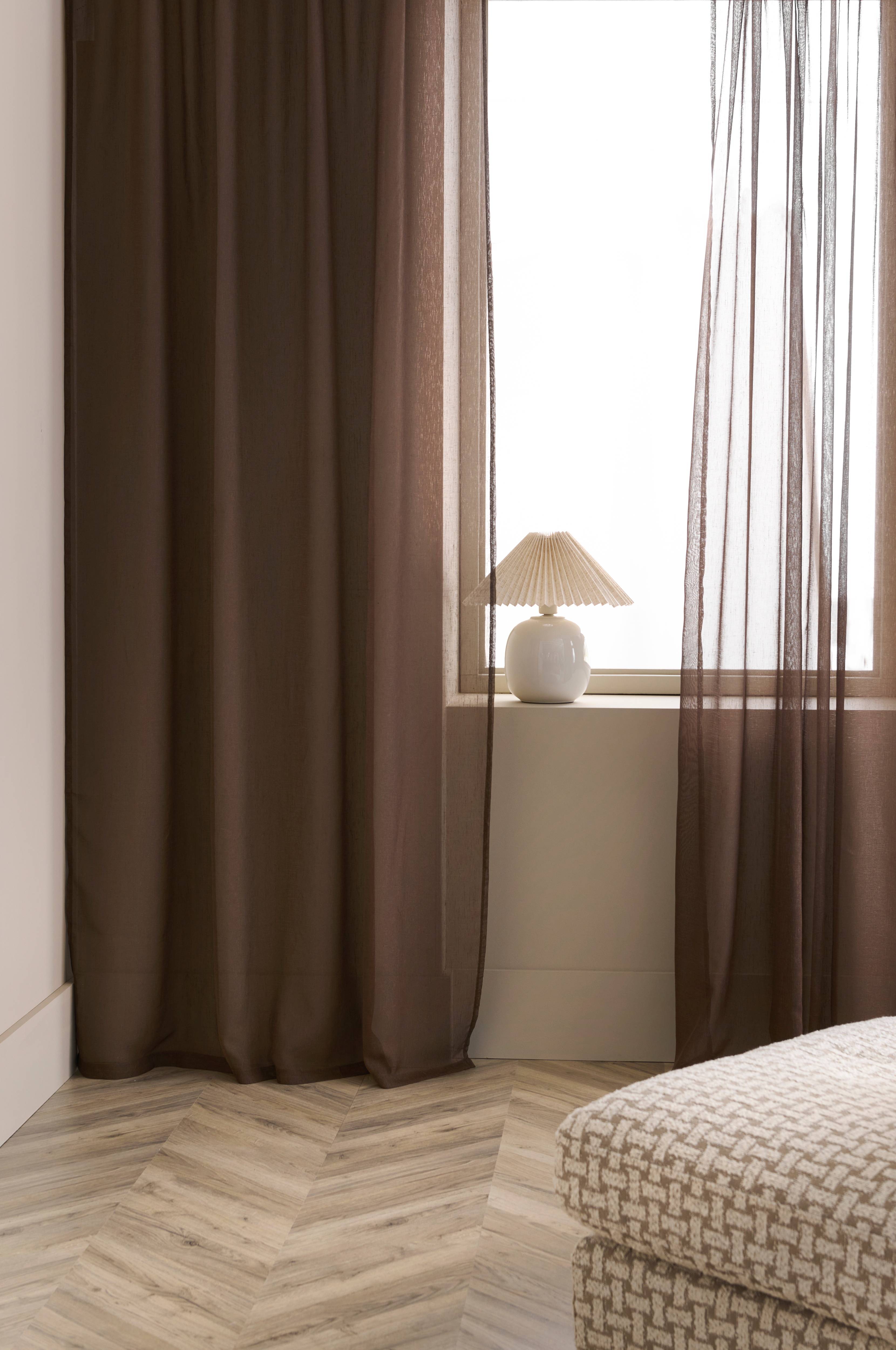 Två multibandslängder i skir, glesvävd polyester. Multibanden gör att du antingen kan hänga gardinerna direkt på en gardinstång genom de gömda hällorna eller använda ringar eller nålkrokar (ej fingerkrokar). Snören i rynkbanden gör att du lätt kan skapa jämna, fina veck. Bredd 140 cm. Gardinerna finns i tre längder: 220, 250 och 300 cm.