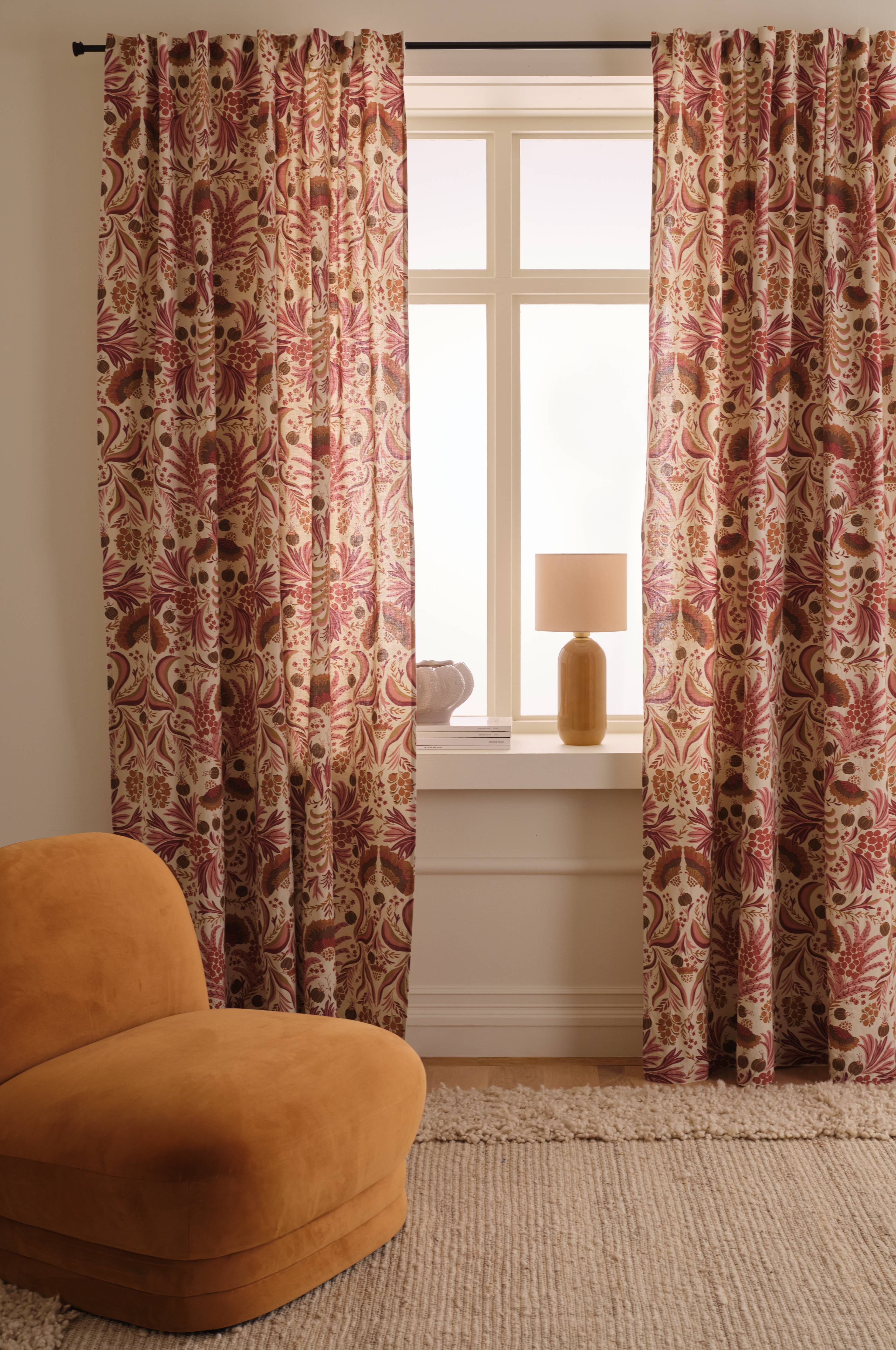 • Två multibandslängder i linnemix med tryckt mönster • Multibanden gör att du antingen kan hänga gardinerna direkt på en gardinstång genom de gömda hällorna eller använda ringar, nålkrokar eller fingerkrokar. Snören i rynkbandet gör att du lätt kan skapa jämna, fina veck.