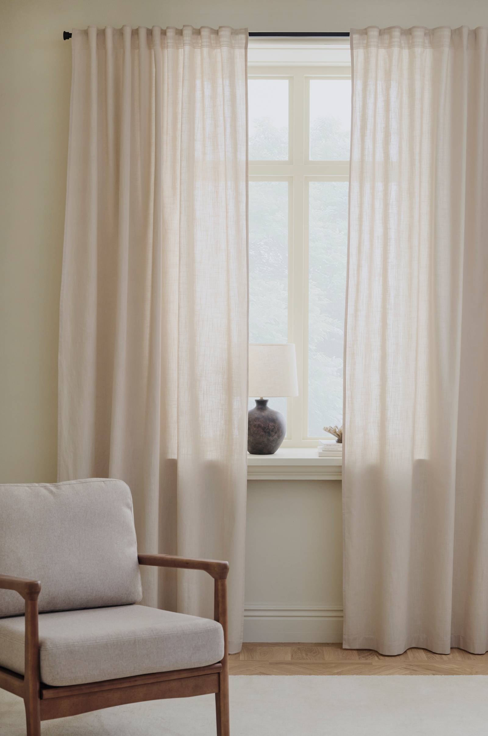 • Multibanden gör att du antingen kan hänga gardinerna direkt på en gardinstång genom de gömda hällorna eller använda ringar, nålkrokar eller fingerkrokar. Snören i rynkbandet gör att du lätt kan skapa jämna, fina veck.