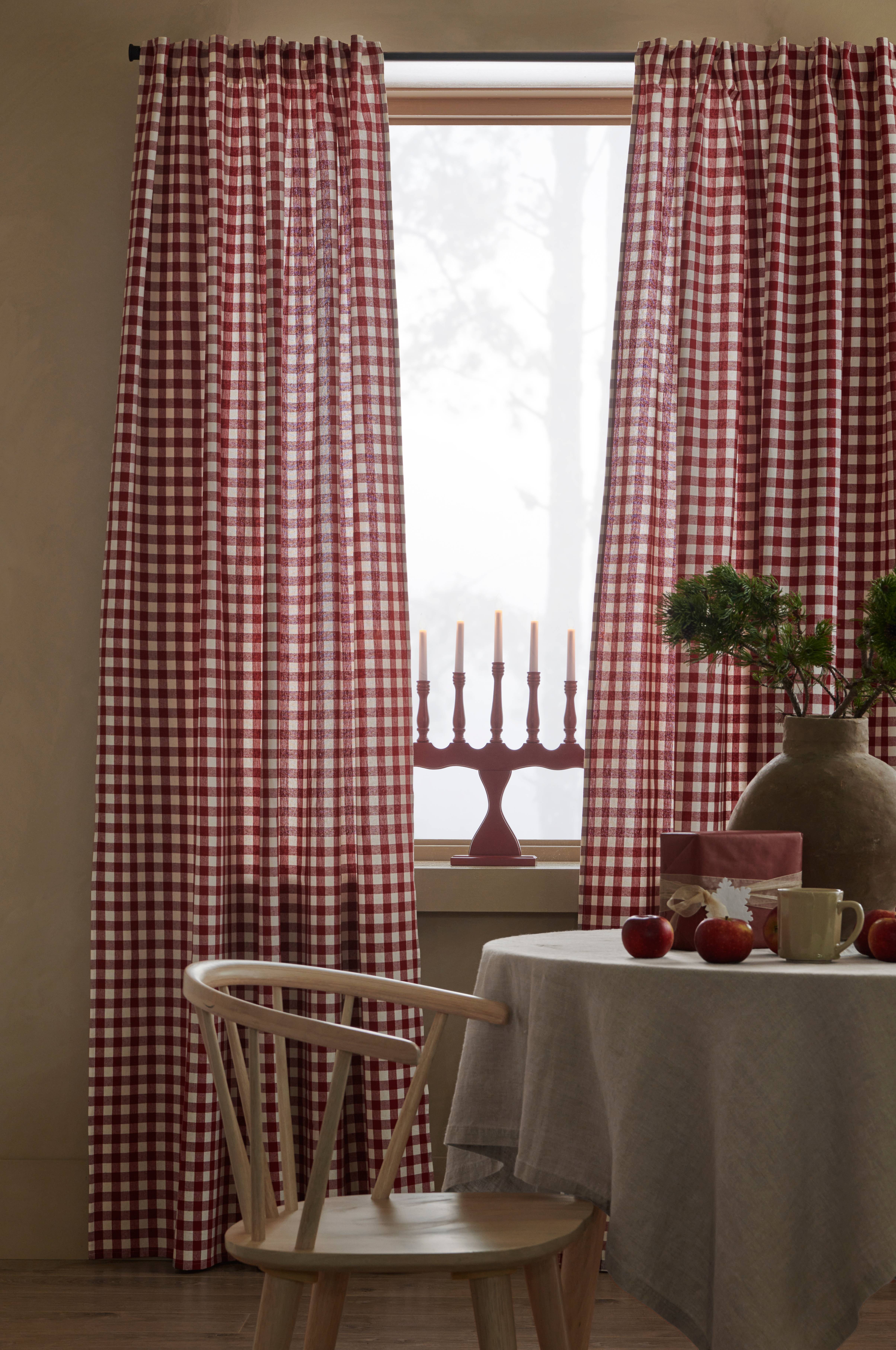 Två multibandslängder med garnfärgade rutor. Multibanden gör att du antingen kan hänga gardinerna direkt på en gardinstång genom de gömda hällorna eller använda ringar, nålkrokar eller fingerkrokar. Bredd 140 cm. Tre längder: 160, 220 och 250 cm.