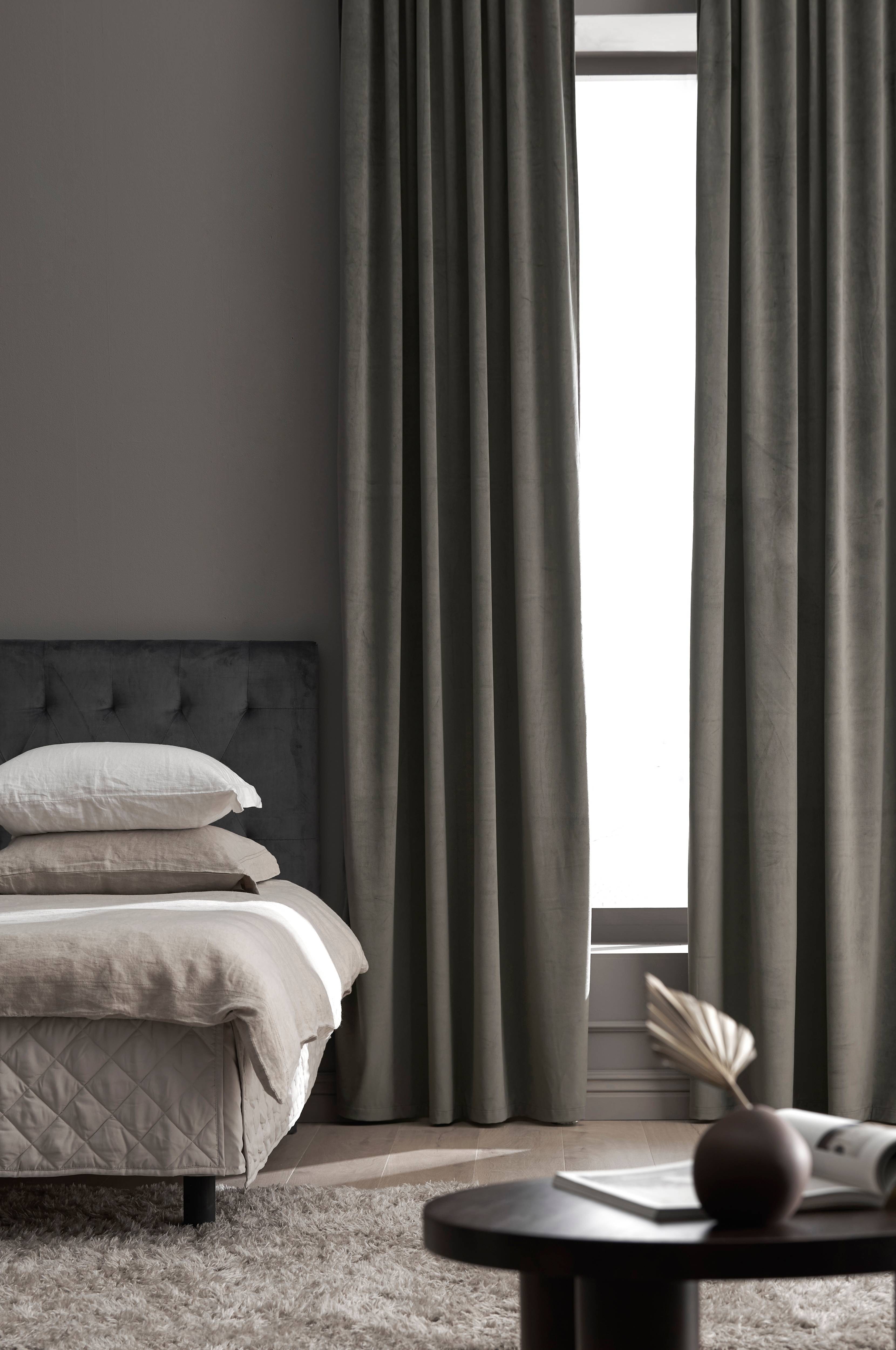 Två multibandslängder i sammet av polyester. Multibanden gör att du antingen kan hänga gardinerna direkt på en gardinstång genom de gömda hällorna eller använda ringar, nålkrokar eller fingerkrokar. Snöre i rynkbandet gör att du lätt kan skapa jämna, fina veck. Bredd 135 cm. Finns i flera olika längder.