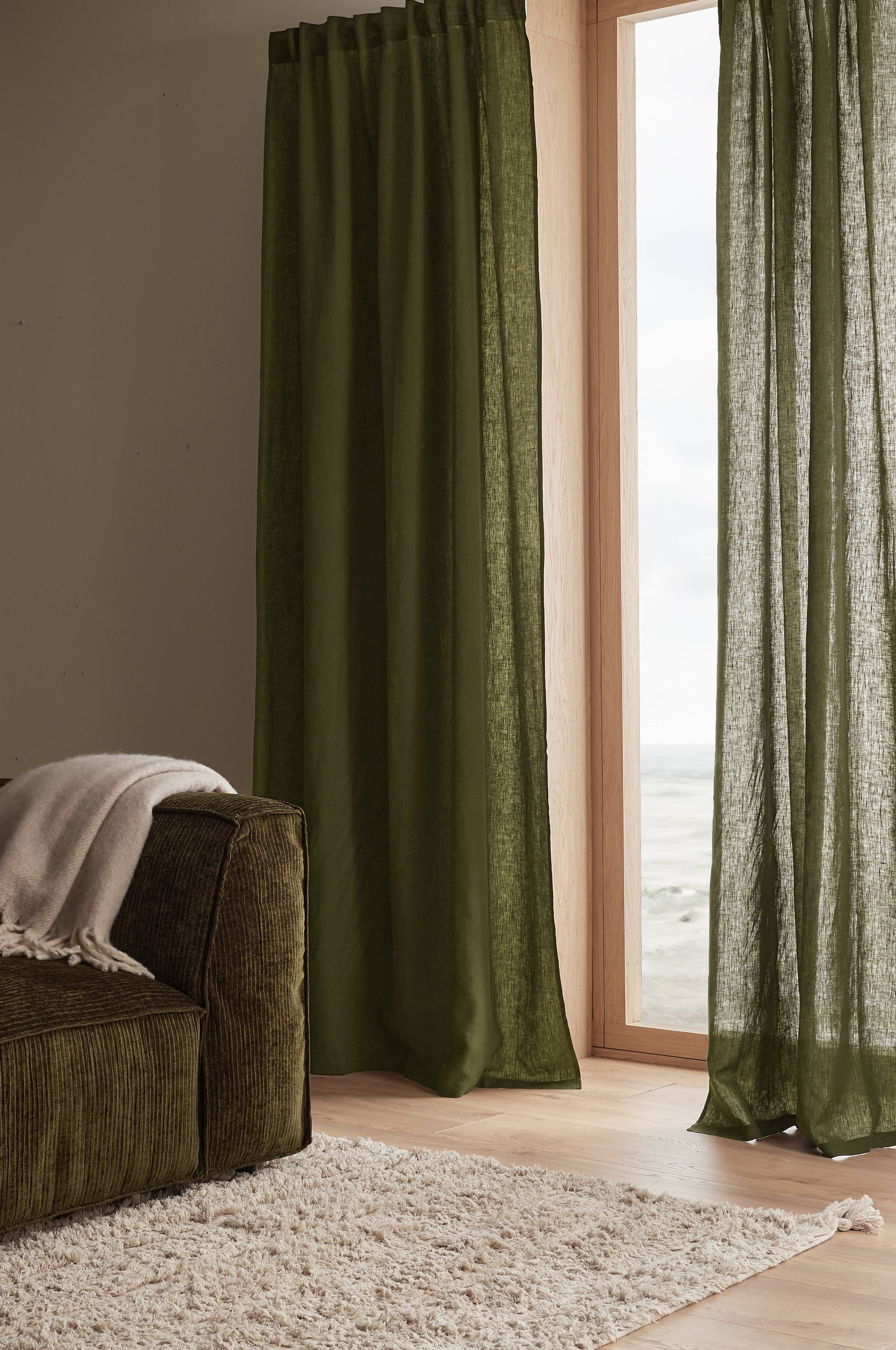 Två multibandslängder i tvättat lin med vacker struktur. Multibanden gör att du antingen kan hänga gardinerna direkt på en gardinstång genom de gömda hällorna eller använda ringar, nålkrokar eller fingerkrokar. Snören i rynkbandet gör att du lätt kan skapa jämna, fina veck. Kan även användas med rynkbandskrokar. Bredd 135 cm. Finns i flera längder.