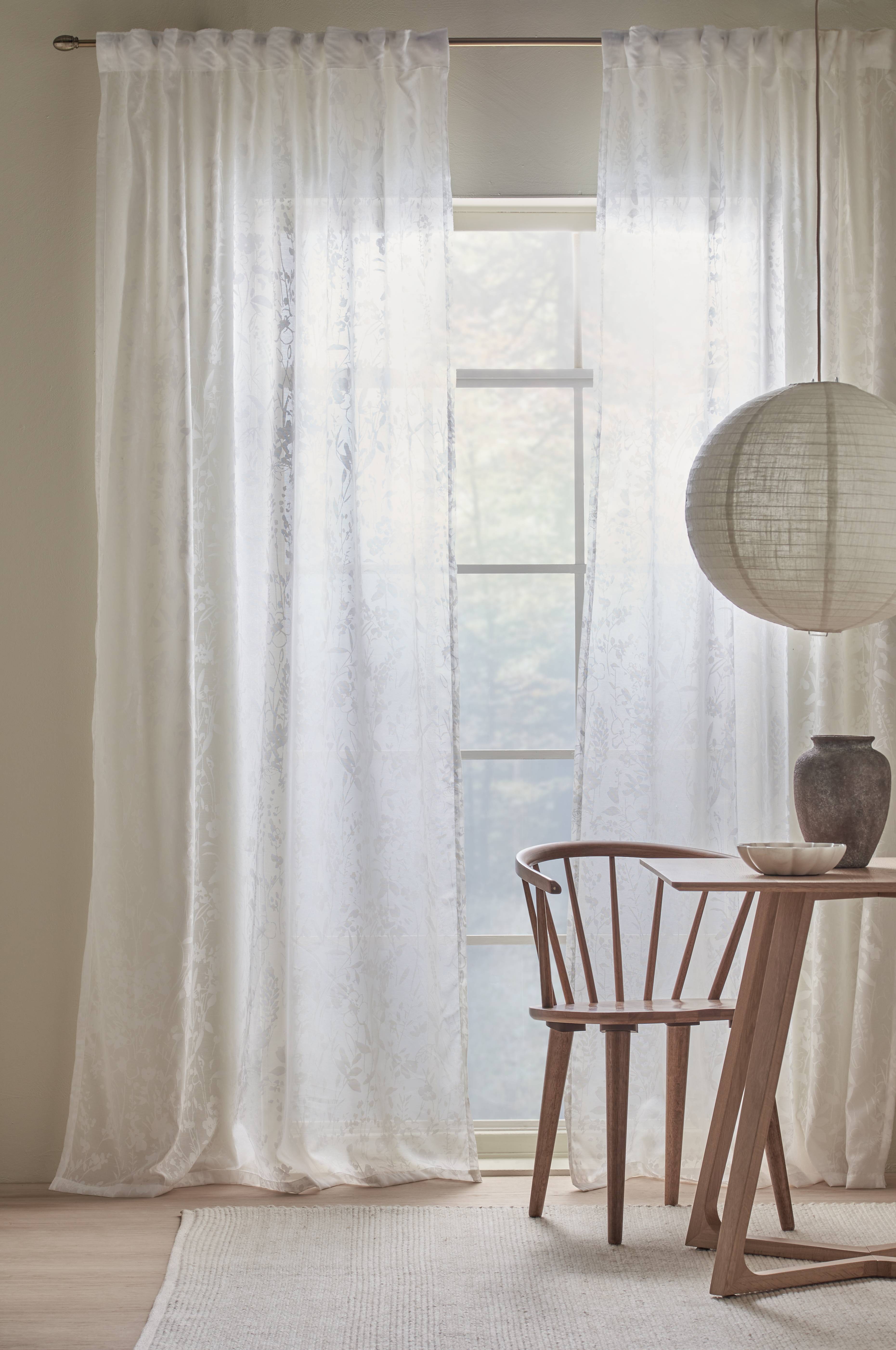 Två multibandslängder i skir, transparent kvalitet med ett sirligt burnout-mönster. Multibanden gör att du antingen kan hänga gardinerna direkt på en gardinstång genom de gömda hällorna eller använda ringar, nålkrokar eller fingerkrokar. Snören i rynkbanden gör att du lätt kan skapa jämna, fina veck.