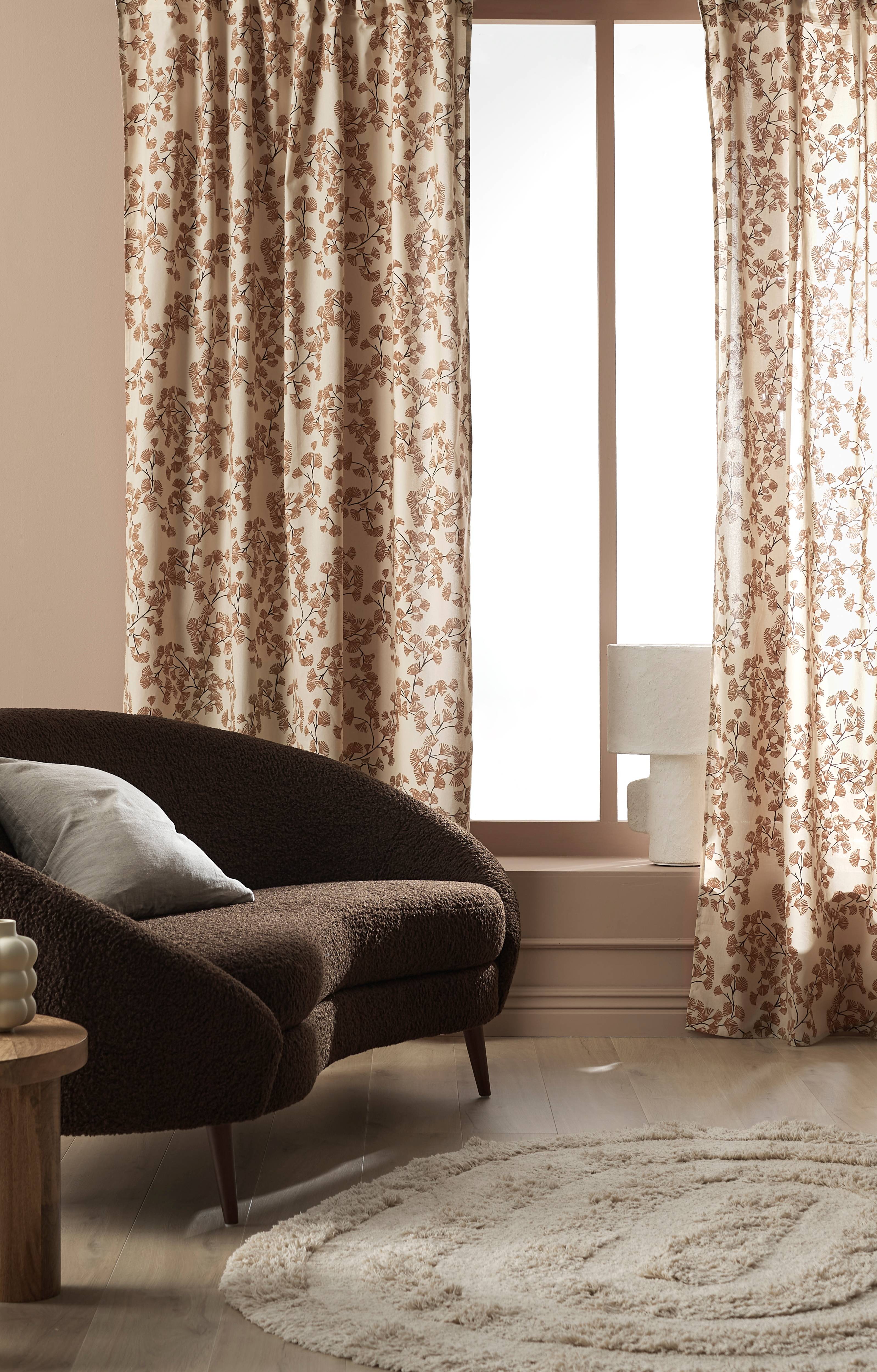 Två multibandslängder med tryckt mönster. Multibanden gör att du antingen kan hänga gardinerna direkt på en gardinstång genom de gömda hällorna eller använda ringar, nålkrokar eller fingerkrokar. Bredd 140 cm.