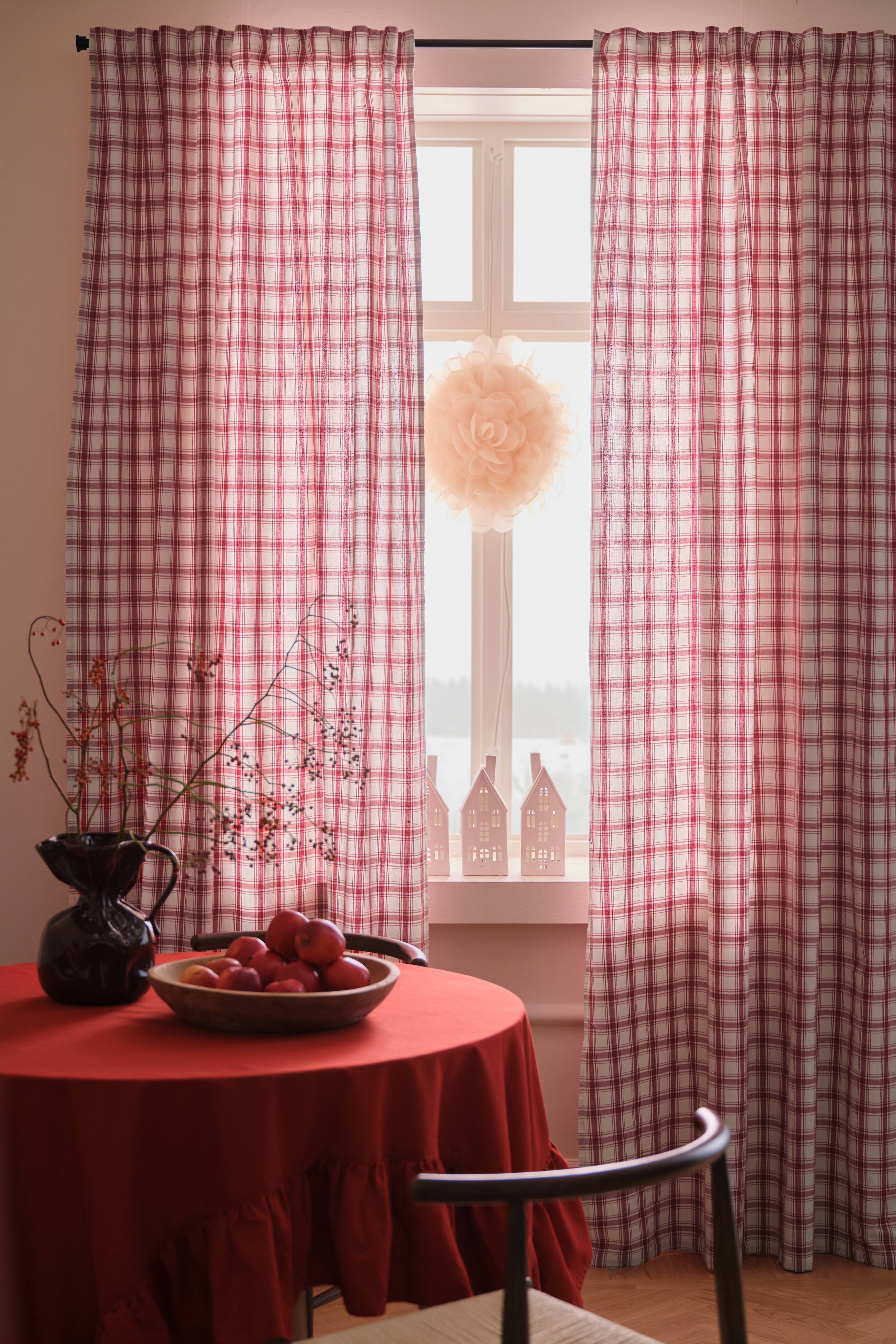 • Två multibandslängder i bomull med garnfärgade rutor • Multibanden gör att du antingen kan hänga gardinerna direkt på en gardinstång genom de gömda hällorna eller använda ringar, nålkrokar eller fingerkrokar. Snören i rynkbandet gör att du lätt kan skapa jämna, fina veck.