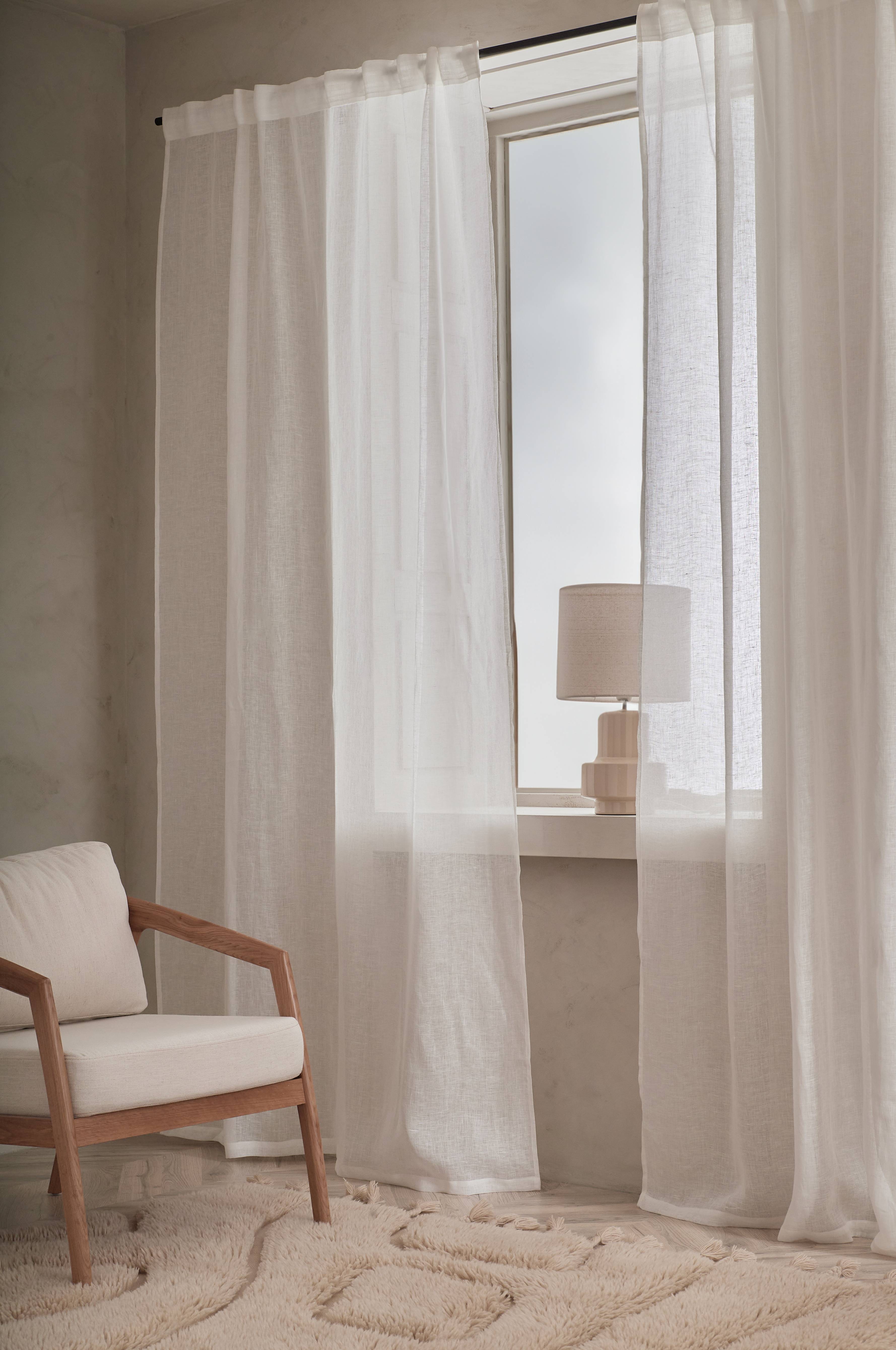 Två multibandslängder av glesvävt lin. Mjuk, skir kvalitet med melangeeffekt. Multibanden gör att du antingen kan hänga gardinerna direkt på en gardinstång genom de gömda hällorna eller använda ringar, nålkrokar eller fingerkrokar. Snören i rynkbandet gör att du lätt kan skapa jämna, fina veck.
