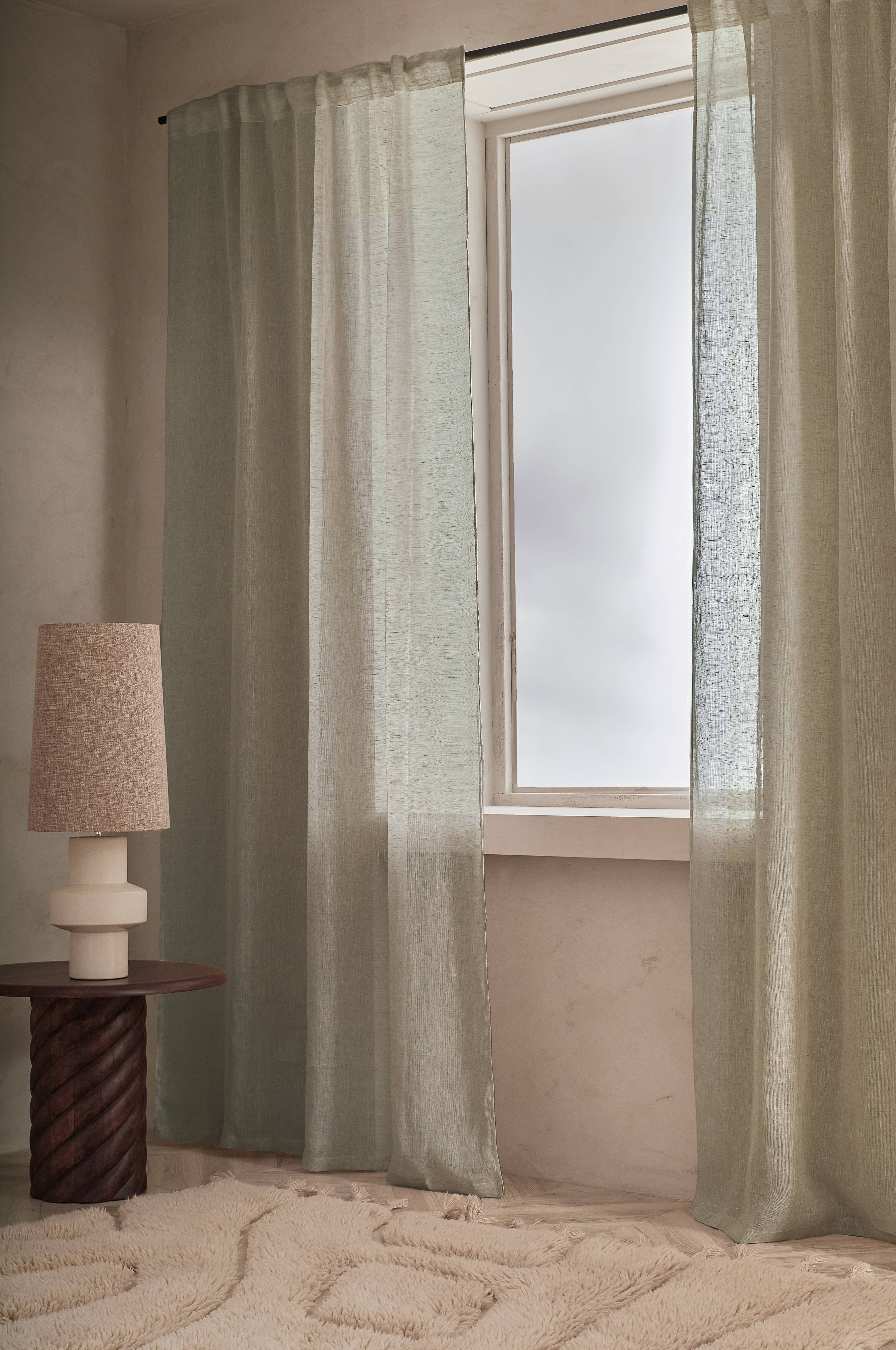 Två multibandslängder av glesvävt lin. Mjuk, skir kvalitet med melangeeffekt. Multibanden gör att du antingen kan hänga gardinerna direkt på en gardinstång genom de gömda hällorna eller använda ringar, nålkrokar eller fingerkrokar. Snören i rynkbandet gör att du lätt kan skapa jämna, fina veck.