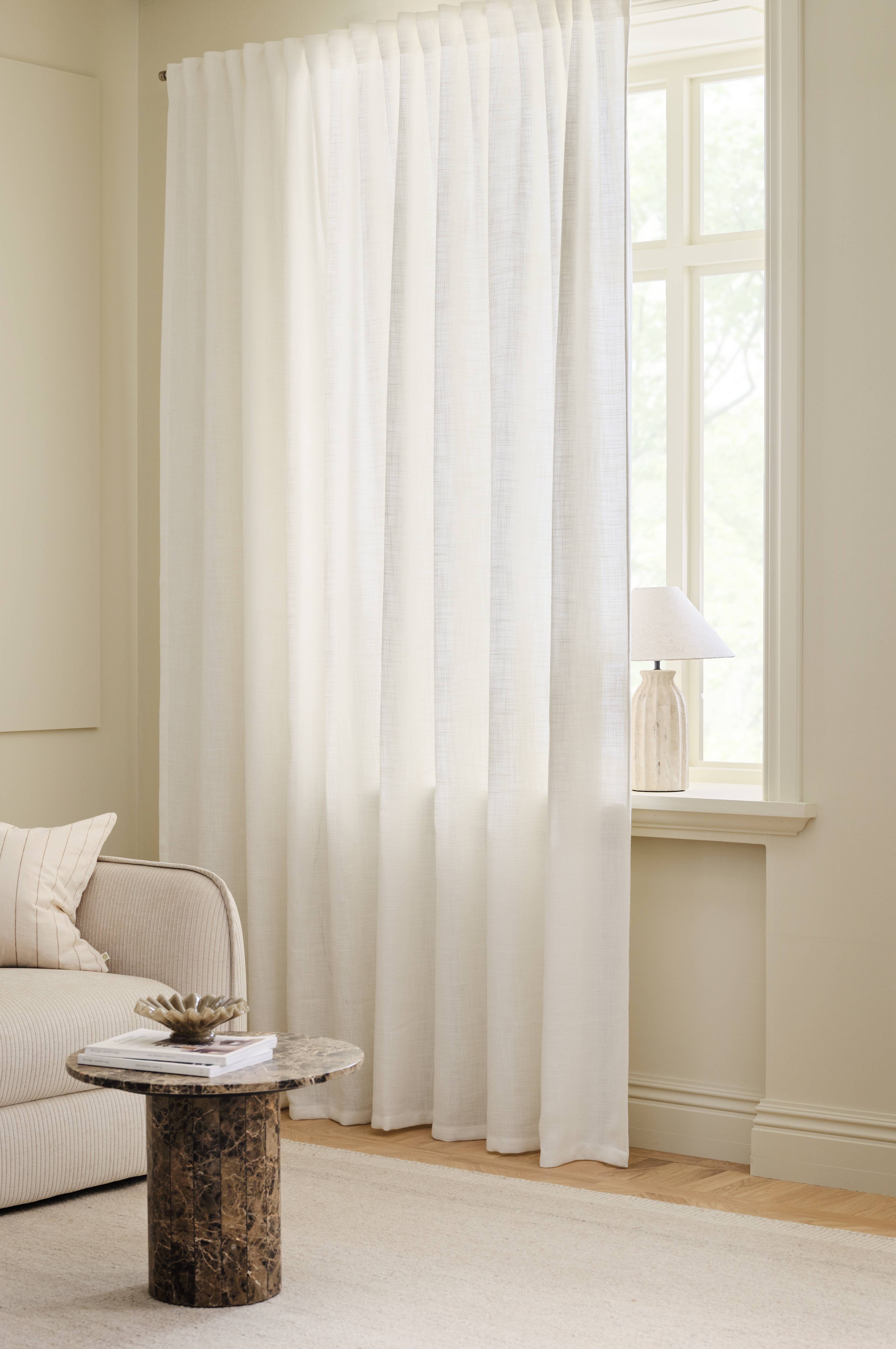 • Multibanden gör att du antingen kan hänga gardinerna direkt på en gardinstång genom de gömda hällorna eller använda ringar, nålkrokar eller fingerkrokar. Snören i rynkbandet gör att du lätt kan skapa jämna, fina veck.