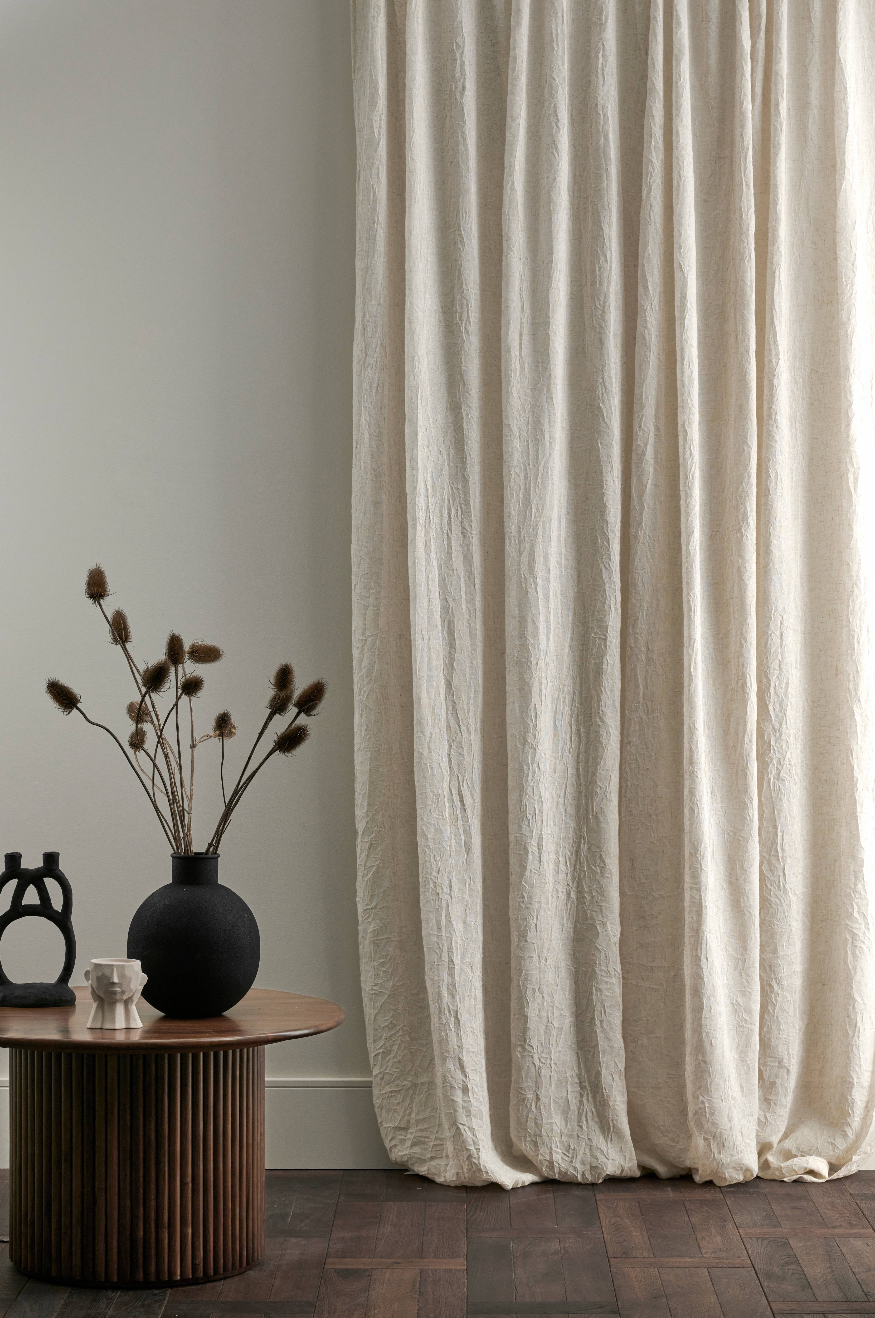 Multibandslängd i glesvävd, skir och lätt krinklad linvoile. Multibandet gör att du antingen kan hänga gardinen direkt på en gardinstång genom de gömda hällorna eller använda ringar och nålkrokar (ej fingerkrokar). Snöre i rynkbandet gör att du lätt kan skapa jämna, fina veck. Overlock på nederkanten. Bredd 260 cm. Längd 300 cm. Säljs i 1-styck.