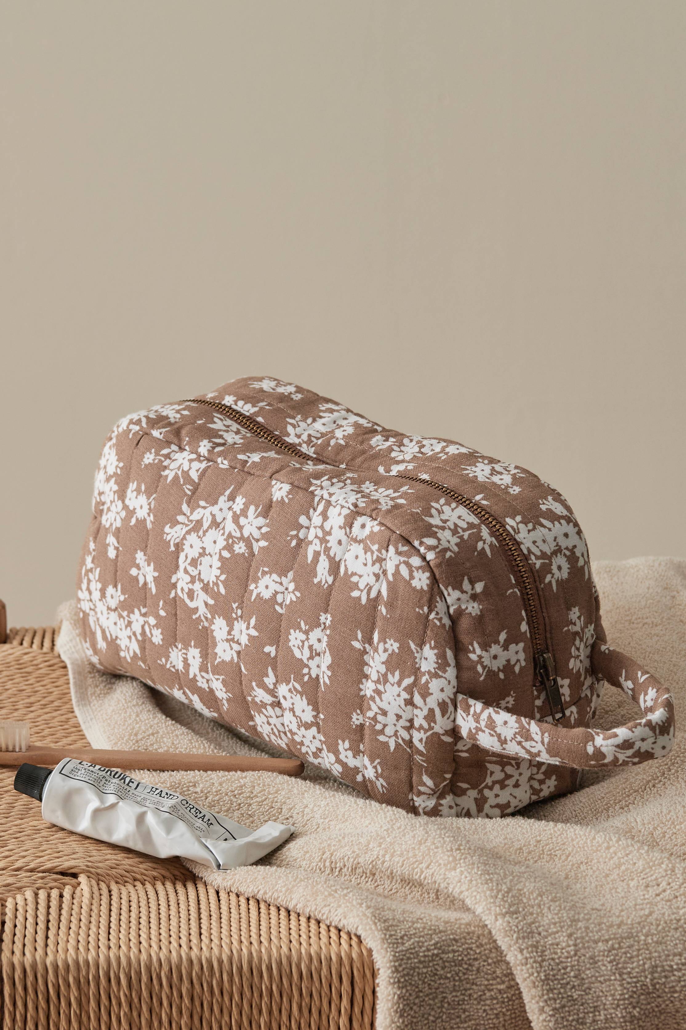 Quiltad och lätt vadderad necessär i muslin av ekologisk bomull. Stängning med dragkedja. En invändig öppen ficka. Bärhandtag på ena kortsidan. Mått: B27 x H17 x D9 cm.