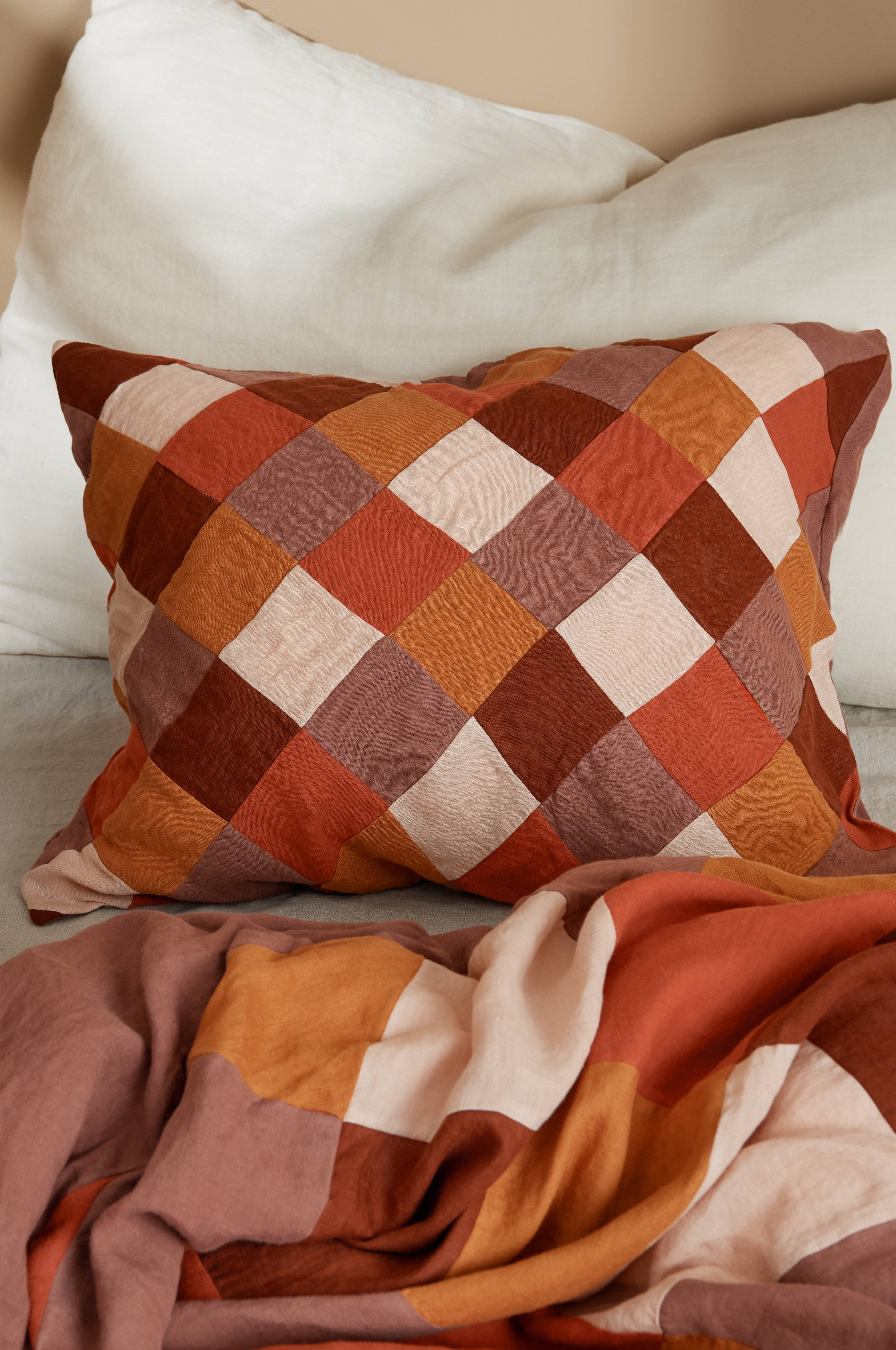 Örngott i tvättat lin. Patchwork på framsidan med handklippta rutor som sytts för hand. Enfärgad baksida.