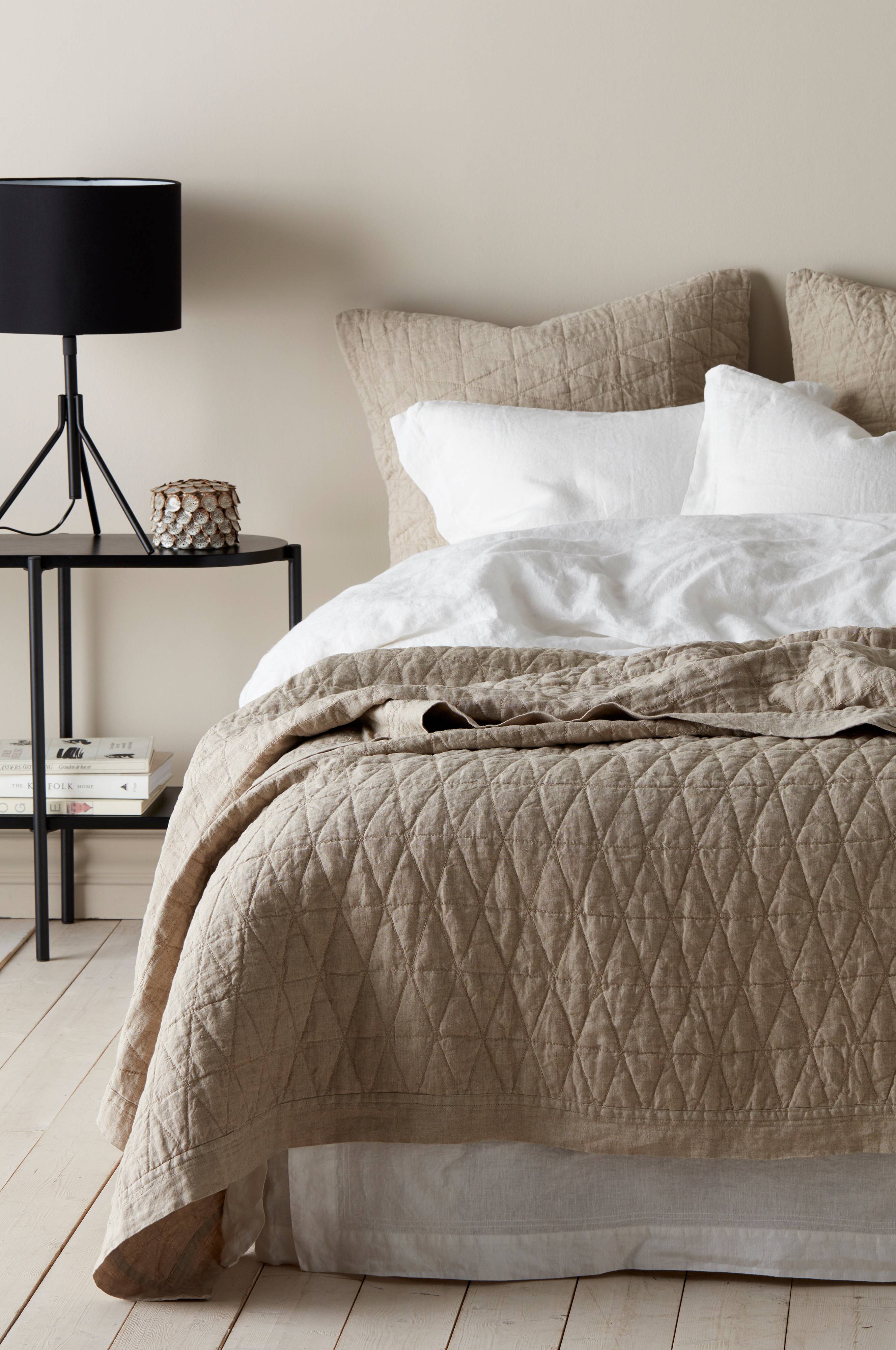 Överkast i tvättat lin med quiltat grafiskt mönster. 5 cm kant runt om. Stl 260x260 cm (passar till säng 160x200cm och 180x200 cm).