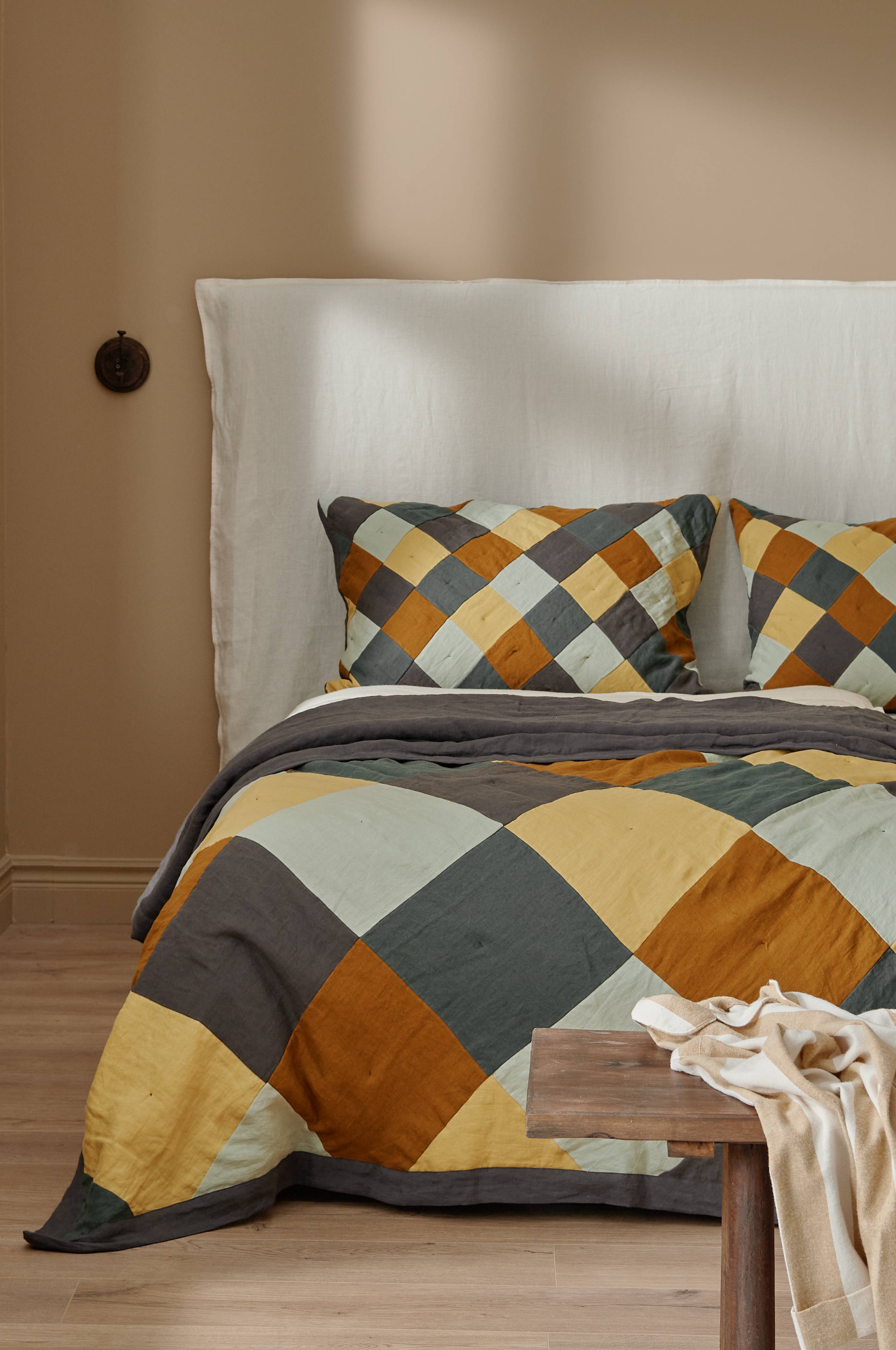 Quiltat överkast i tvättat lin. Patchwork på framsidan med handklippta rutor som sytts för hand. Enfärgad baksida. Enfärgad kant runt om.