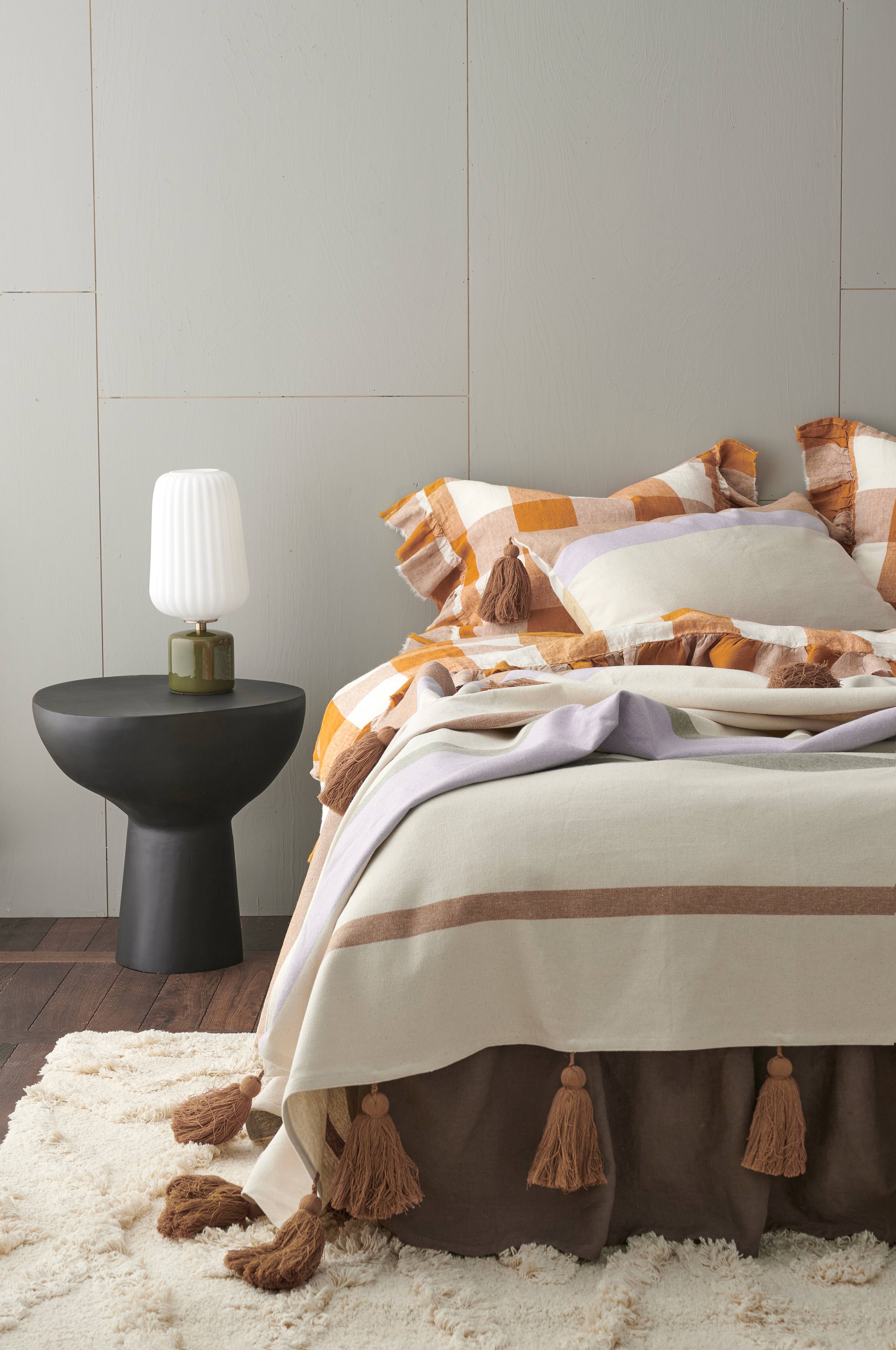 Randvävt, garnfärgat överkast i bomull med tofsar längs överkanten och nederkanten. Fållade kanter runt om.
