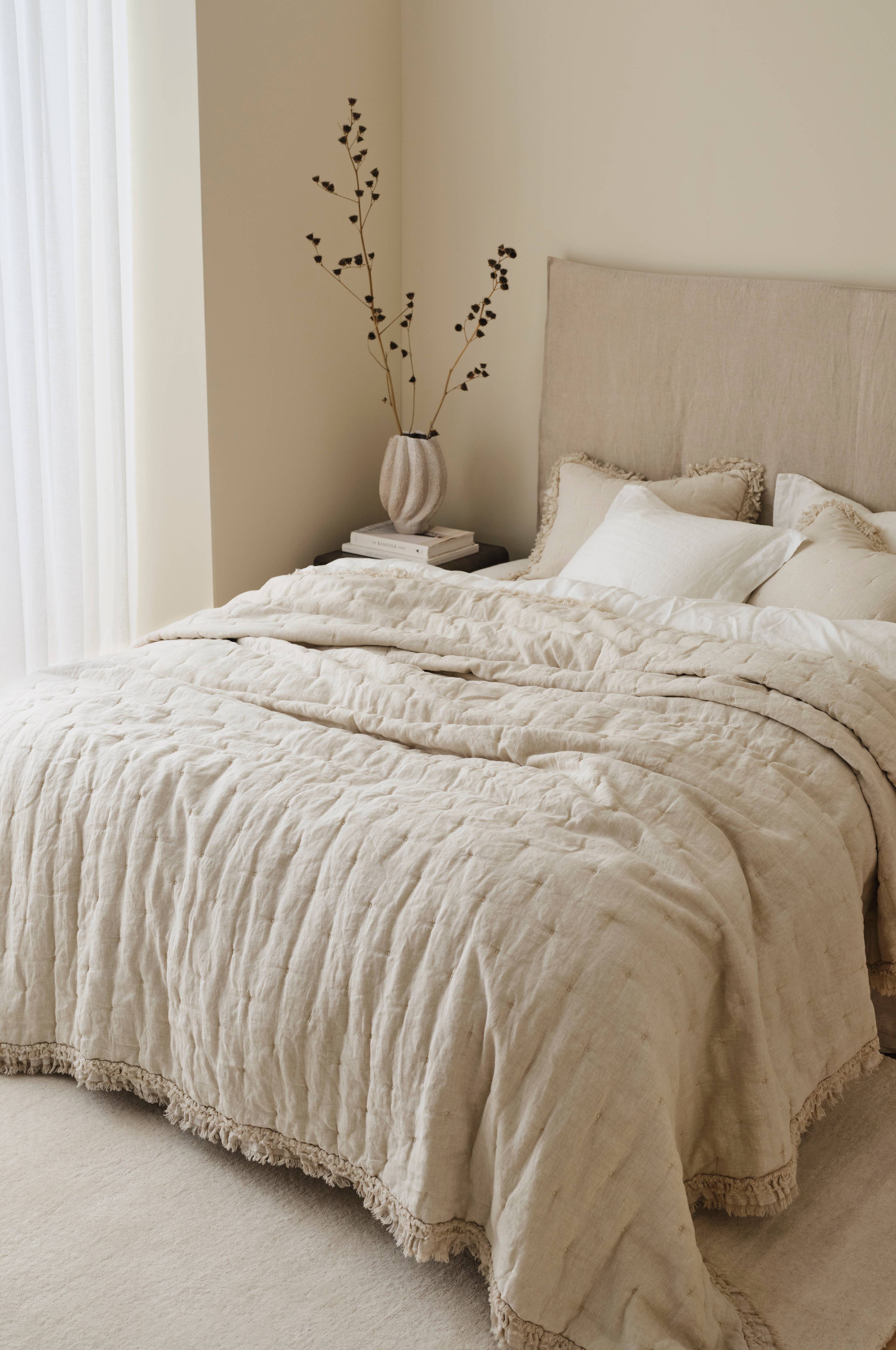 • Överkast i en mjuk och behaglig tvättad linnekvalitet från Frankrike • Baksida i bomull • Sydda prickar • Dubbel volangkant runt om • Överkastet finns i tre storlekar: 150x250 cm (passar säng 90x200 och 105x200 cm) 180x260 cm (passar säng 120x200 och 140x200 cm) 260x260 cm (passar säng 160x200 och 180x200 cm)