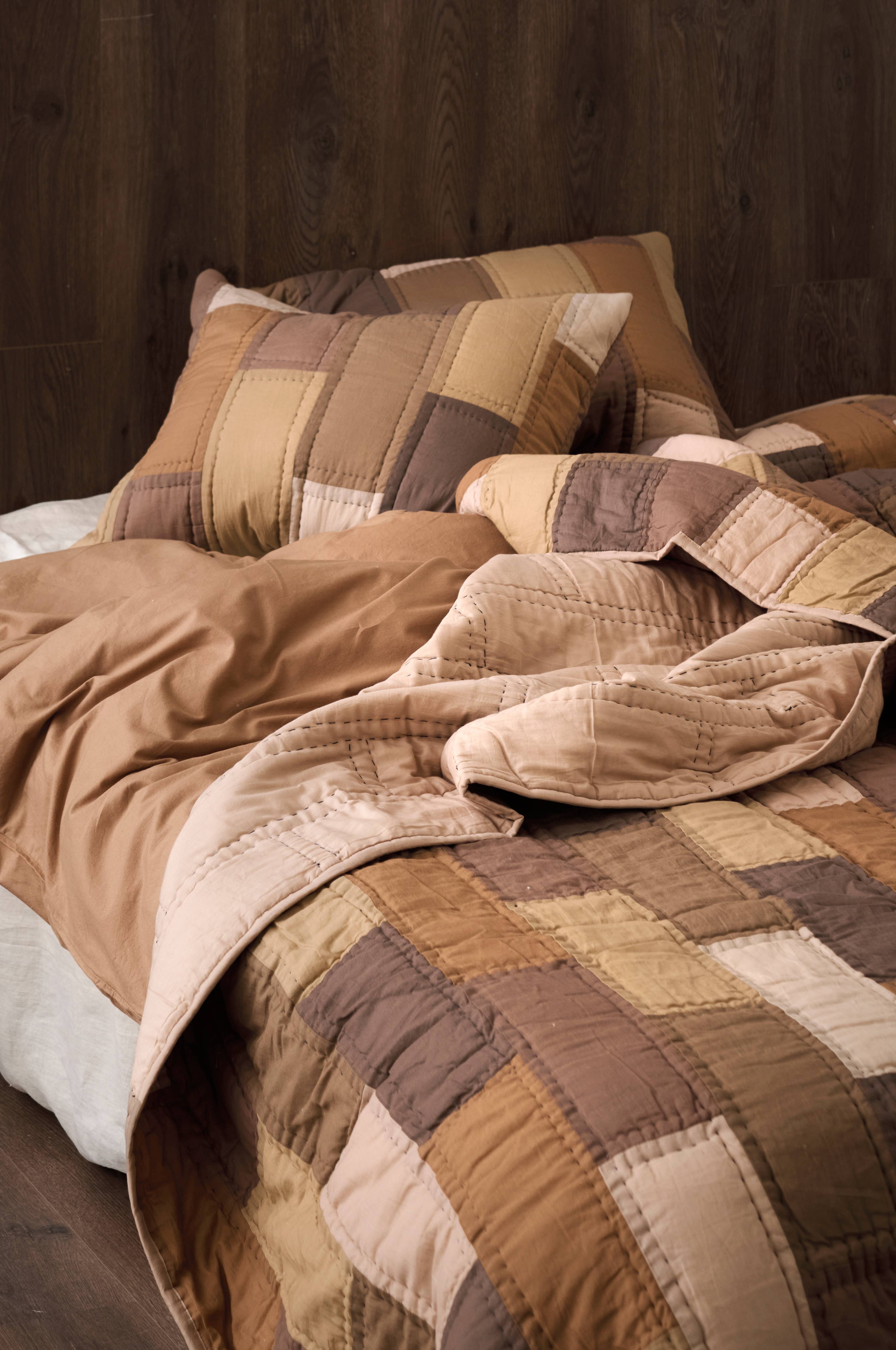 Handquiltat överkast i mjuk, tvättad bomullsvoile med kantband runt om. Lapptäckmönster på framsidan och enfärgad baksida. Fyllning av 250 g bomull.