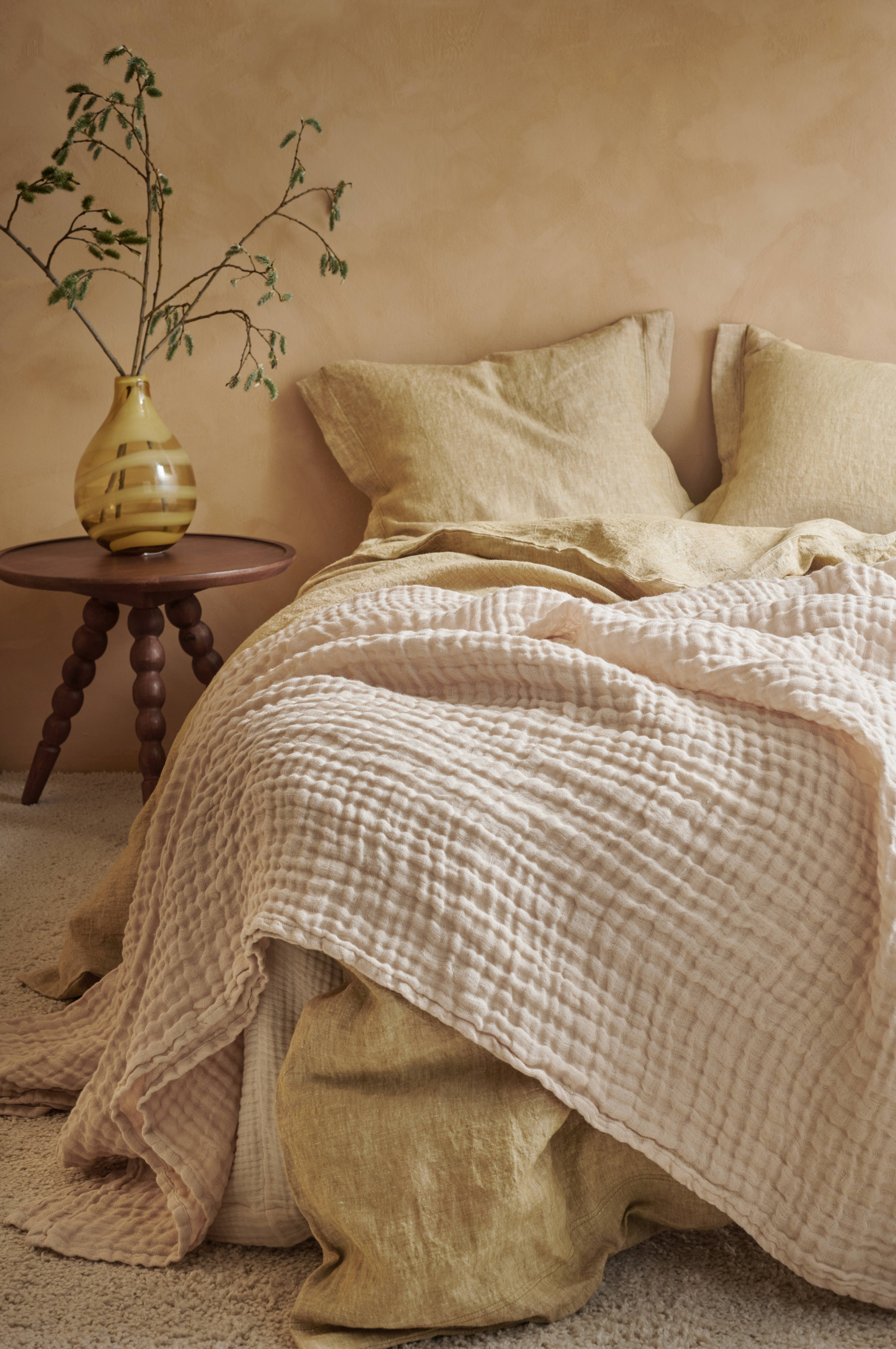 Överkast av tvättat, franskt lin i avslappnad och lätt kvalitet. Överkastet är vävt i tre lager med snygg struktur.